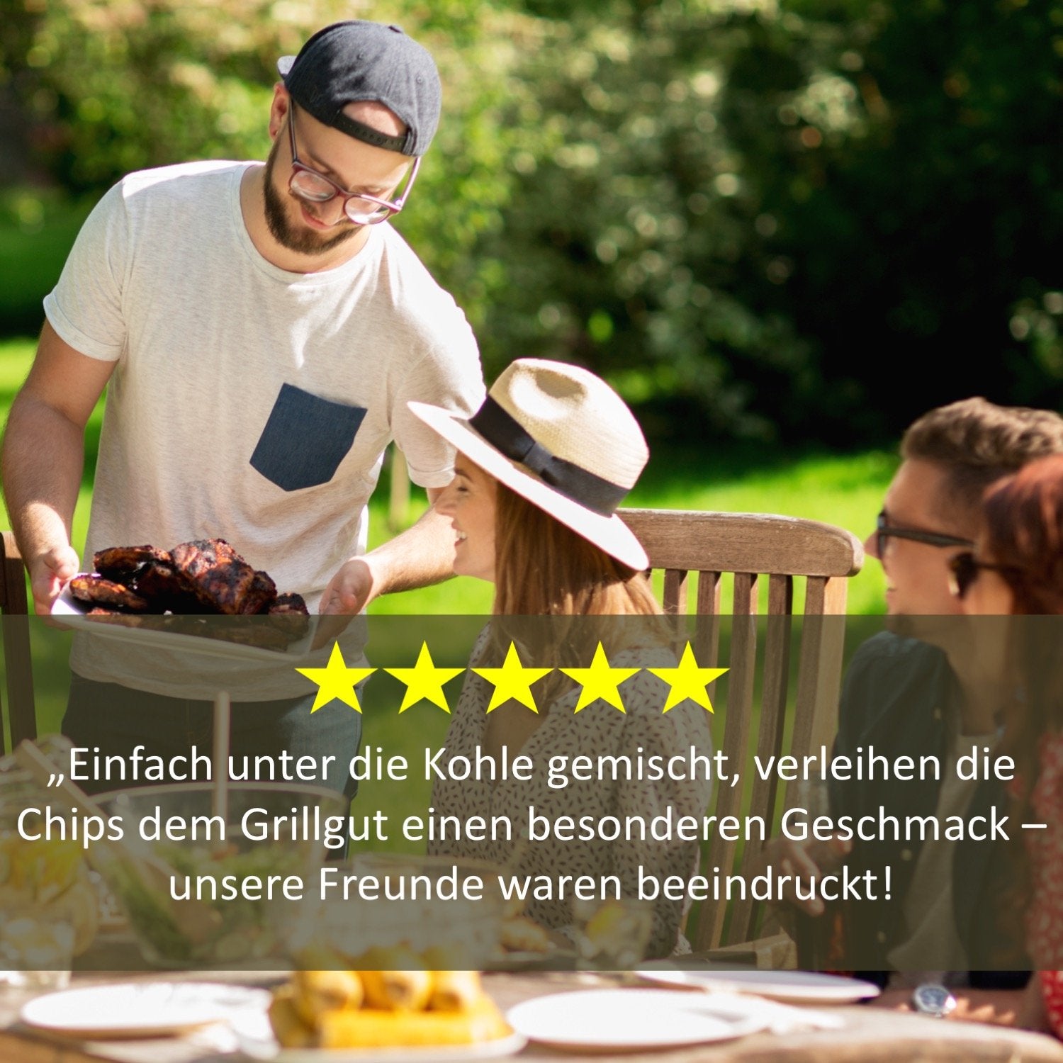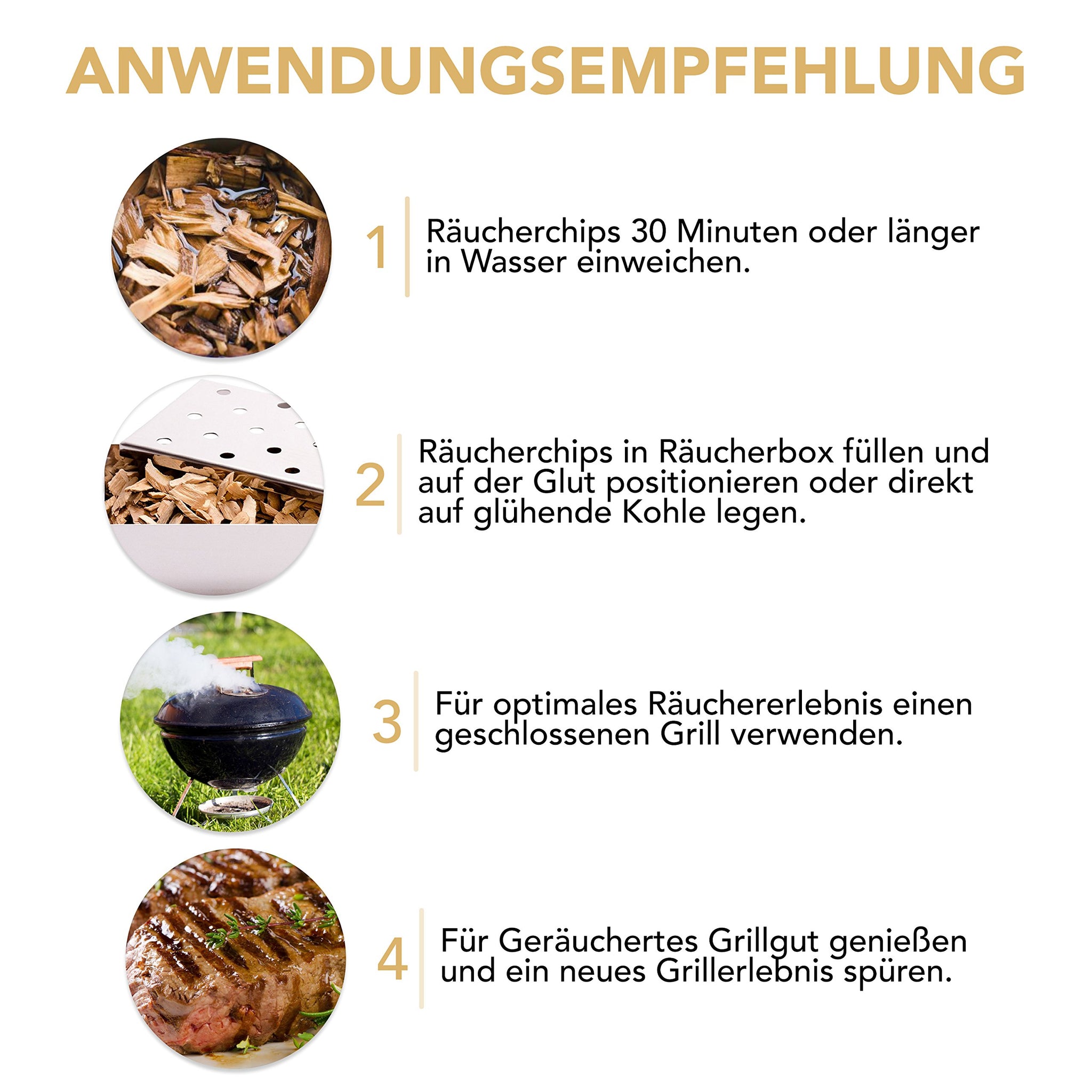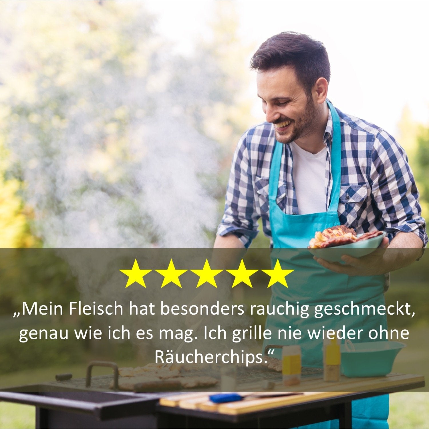 • Particolarmente economico ed efficiente: Axtschlag poco è richiesto per un'applicazione. I chip possono essere porzionati bene a causa della dimensione ideale. Un legno manciata fumatore è sufficiente a dare il cibo alla griglia un fumoso, aroma fruttato.
