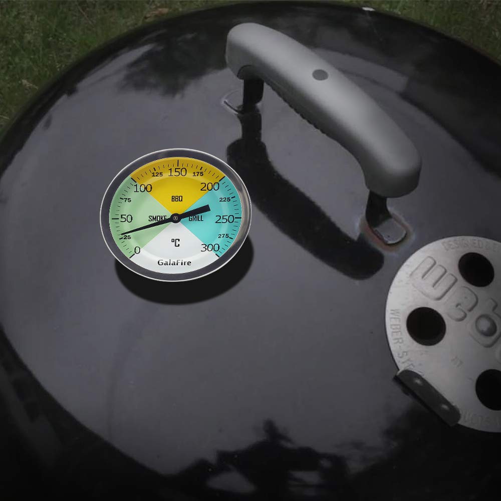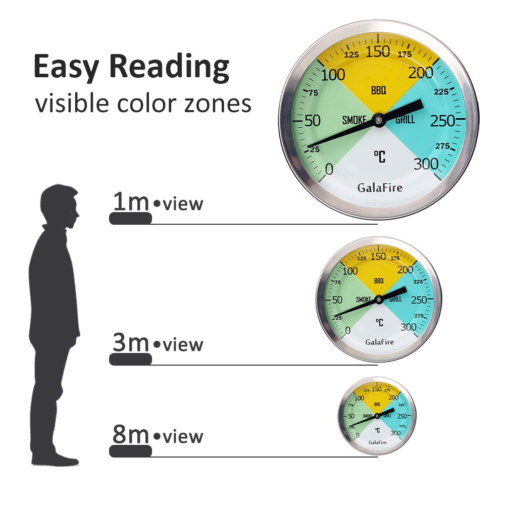 - ✅ GalaFire 3 " termometro per griglia per barbecue con quadrante grande. Le zone fumo, barbecue e grill sono chiaramente visibili con 3 colori diversi. Grandi numeri, ago nero allungato, facilita la lettura da molto lontano.