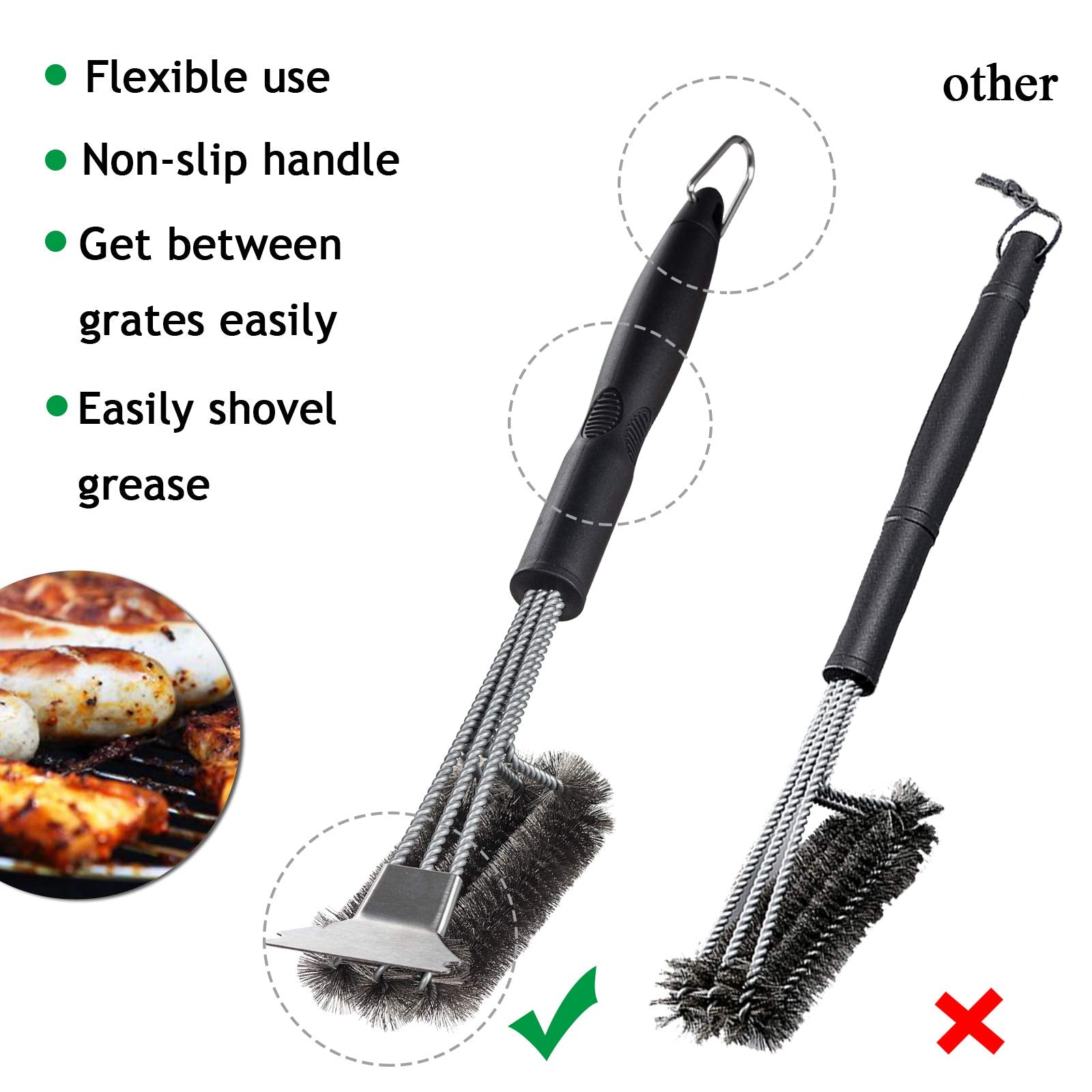 - [Impugnatura robusta e leggera] La lussuosa impugnatura della spazzola per la pulizia del barbecue è comoda, lenitiva e ha un maggiore effetto leva e controllo durante la pulizia di griglie sporche. Inoltre viene fornito con un anello robusto per appendere la spazzola per barbecue.