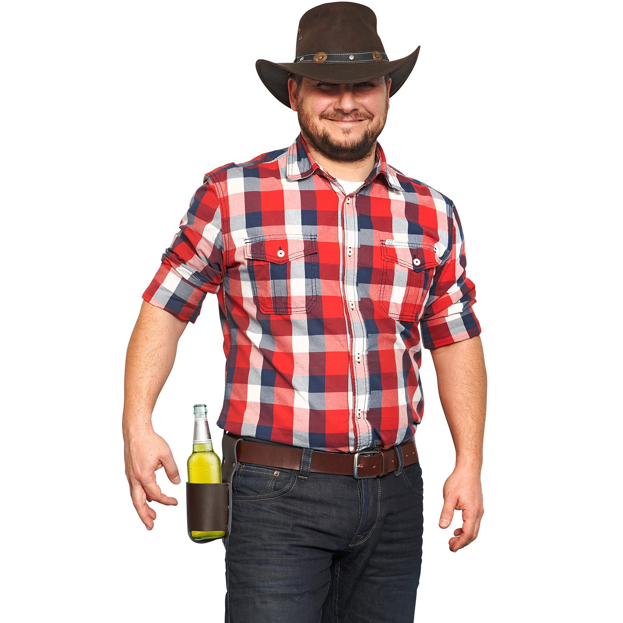 The Beer Holster "Classic" è un assoluto must-have per tutti gli uomini veri. Le tue mani non saranno più legati alla bottiglia di birra, ma sono disponibili per compiti molto più importanti come girando la carne sulla griglia, giocare a calcio balilla o falciare il prato. Naturalmente, la birra ancora rimane sempre disponibile a condizioni di mercato. Basta disegnare la bottiglia, godere di un sorso e metterlo a destra di nuovo nella fondina. Il portabottiglie pratica avviene in vita e tiene una bottiglia o lattina di fino a 0,5 litri. È sufficiente far scorrere la fondina sopra la cintura massimo 4 cm di larghezza e il gioco è fatto! La sua produzione solido fatto da cuoio reale, fili di nylon e borchie di metallo e la sua superficie idrorepellente rendono la birra fondina "classico" un dono di alta qualità per tutti gli uomini. La vostra birra o la mia? Beh, se si possiede una "Classic" Beer Holster non avrete bisogno di chiedere. Basta portare il vostro drink con voi in ogni momento. Brillare come il maestro del barbecue e gestire tali compiti temute fai da te con il vostro drink preferito a portata di mano. E se vi capita di organizzare il prossimo addio al celibato, assicurarsi che tutti i tuoi compagni hanno avuto uno, troppo! La fornitura comprende: Birra Holster "Classic" Espresso Brown Dimensioni: 20,0 L x 9,5 W x 7.3 H , Peso: 90 grammi