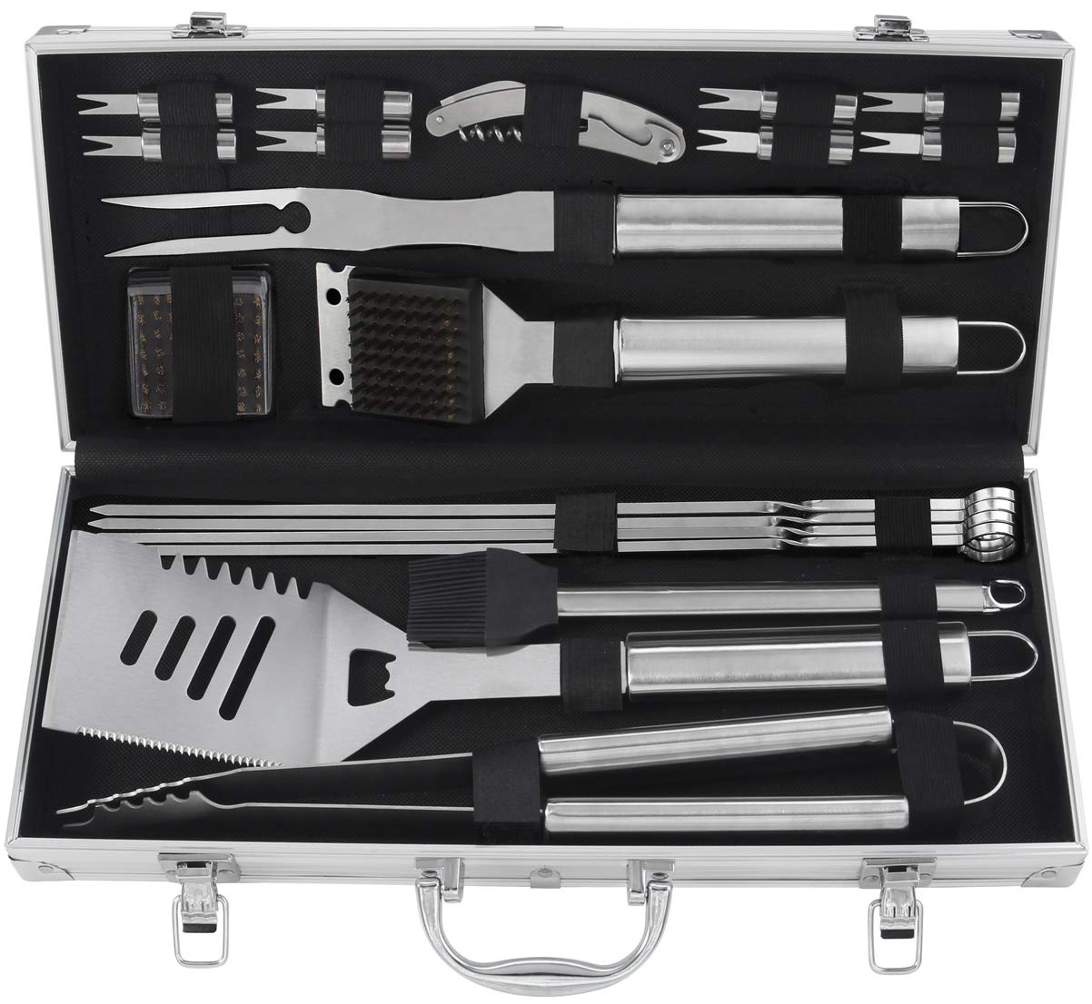 - IL KIT BBQ PIÙ COMPLETO: Set di accessori per barbecue da 20 pezzi comprende 1 spatola per barbecue, 1 forchetta, 1 pennello per imbastitura, 1 pennello per barbecue, 1 testina sostituibile per grill, 1 pinza, 8 supporti per mais, 4 spiedini per barbecue, 1 Custodia in alluminio. Questo è unutensili griglia completo e professionale contiene quasi tutto il necessario per grigliare.