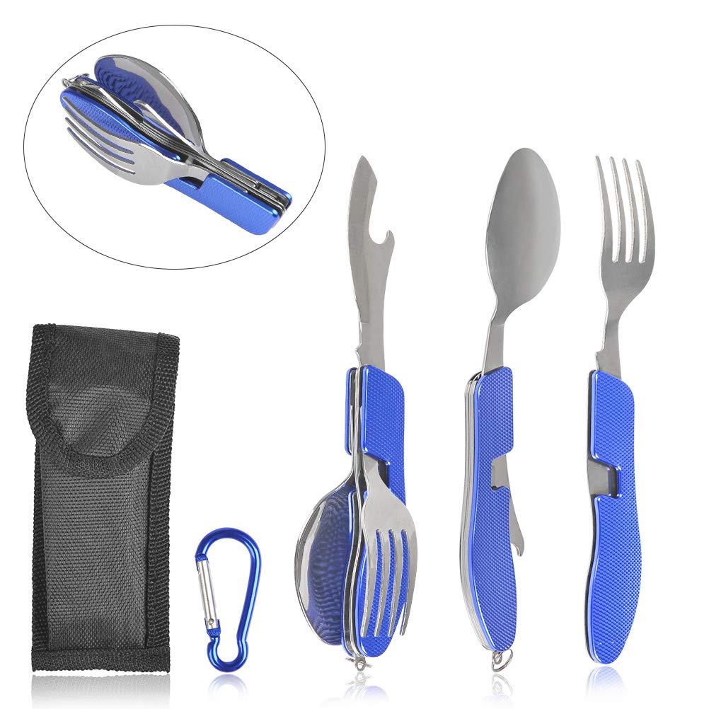 WOWOSS 4-in-1 Posate da Campeggio in Acciaio Inossidabile Pieghevole, Posate da Viaggio con Custodia e Moschettone, Posate Portatile Pieghevole per Viaggio