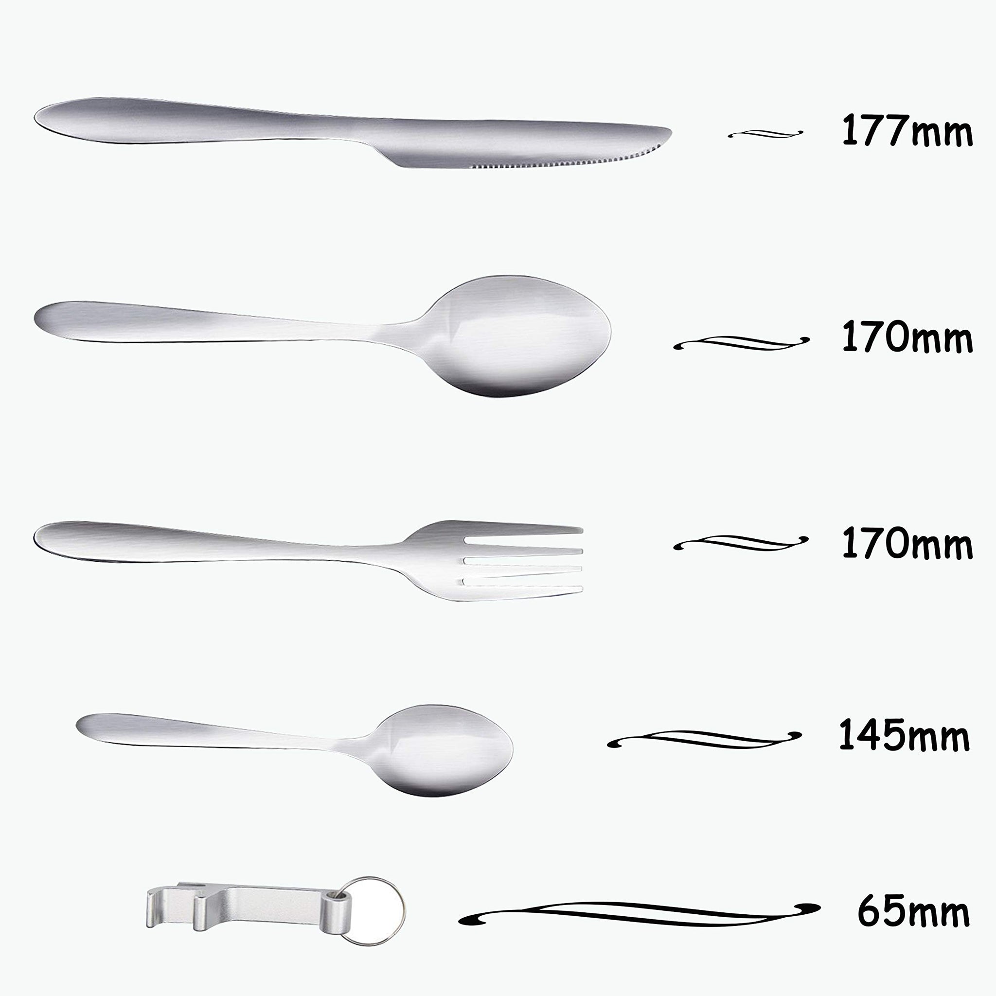 - Dimensioni: coltello: 17,7 cm, cucchiaio: 17 cm, cucchiaino da tè: 14,5 cm, forchetta: 17 cm, apribottiglie: 6,5 cm, con un sacchetto blu può contenere 5 pezzi, può aiutare a riporre insieme, senza preoccuparsi di perdere pezzi.