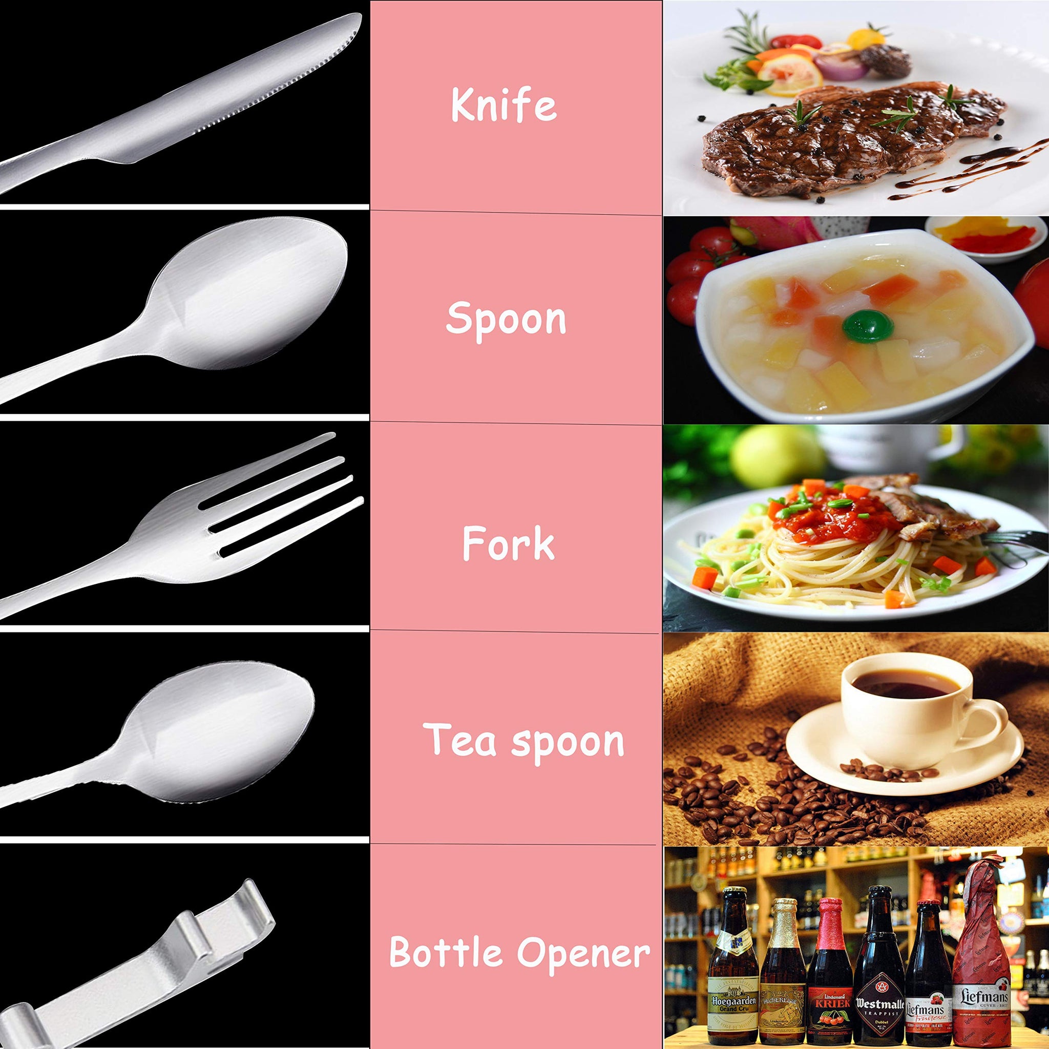 - Quantità: questo set di posate contiene 1 coltello, 1 cucchiaio, 1 cucchiaio, 1 apribottiglie, 1 forchetta. È progettato per sublimare i tavoli, le decorazioni e gli accessori delle vacanze e del campeggio.