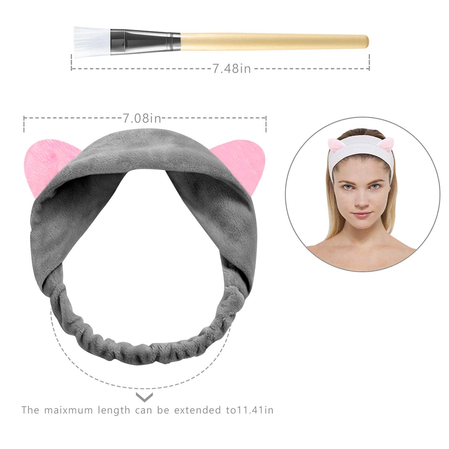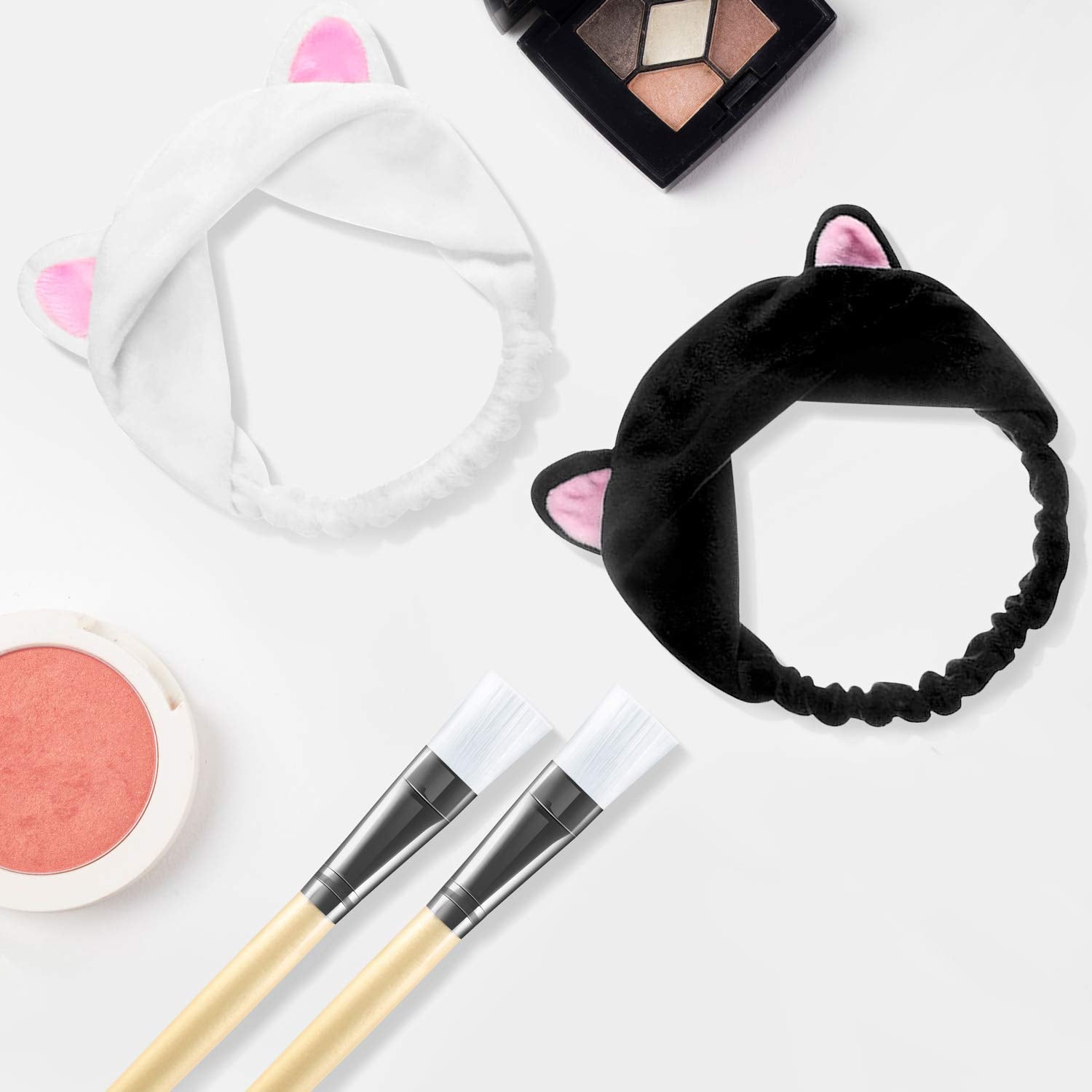 PAMIYO 4pcs Fascia Capelli per Maschera Facciale + 4pcs Pennello Maschera Viso Strumenti per Trucco Elastica Fascetta per Capelli con Gatto Orecchio Strumenti per Trucco Viso