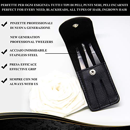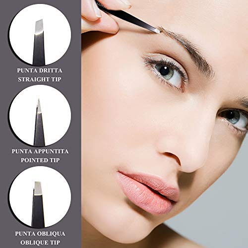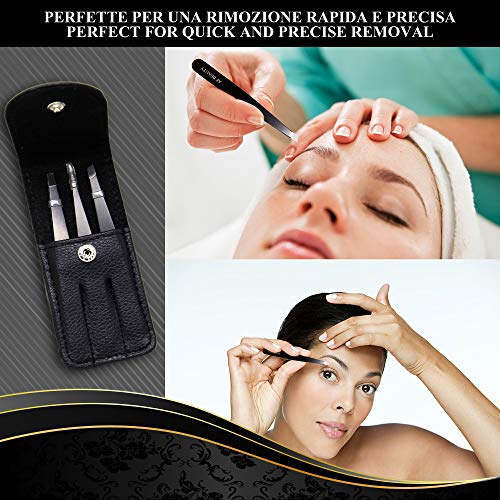 • ⚫ PER OGNI ESIGENZA - Grazie alle varie punte ogni pinzetta ci da sicurezza per gli svariati utilizzi, quella a punta appuntita ci permette un ottima rimozione di peli incarniti e punti neri, quella a punta dritta permette un perfetta aderenza in modo da non lasciarci scappare i peli più duri e ostinati e infine quella a punta obliqua ci permette di raggiungere e rimuovere in maniera professionale spine, sopraciglia magnetiche finte