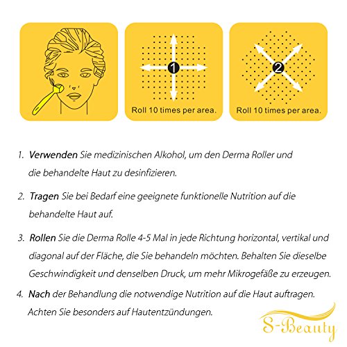- Funzioni efficaci: la pelle si rigenera naturalmente circa ogni 28 giorni.Con Derma Roller potete accelerare la rigenerazione della pelle. In molti casi gli effetti saranno visibili dopo il primo trattamento. Miglioramento generale della struttura della pelle, stimolazione della produzione di collagene, rinnovamento dell'epidermide, riduzione dei grandi pori.
