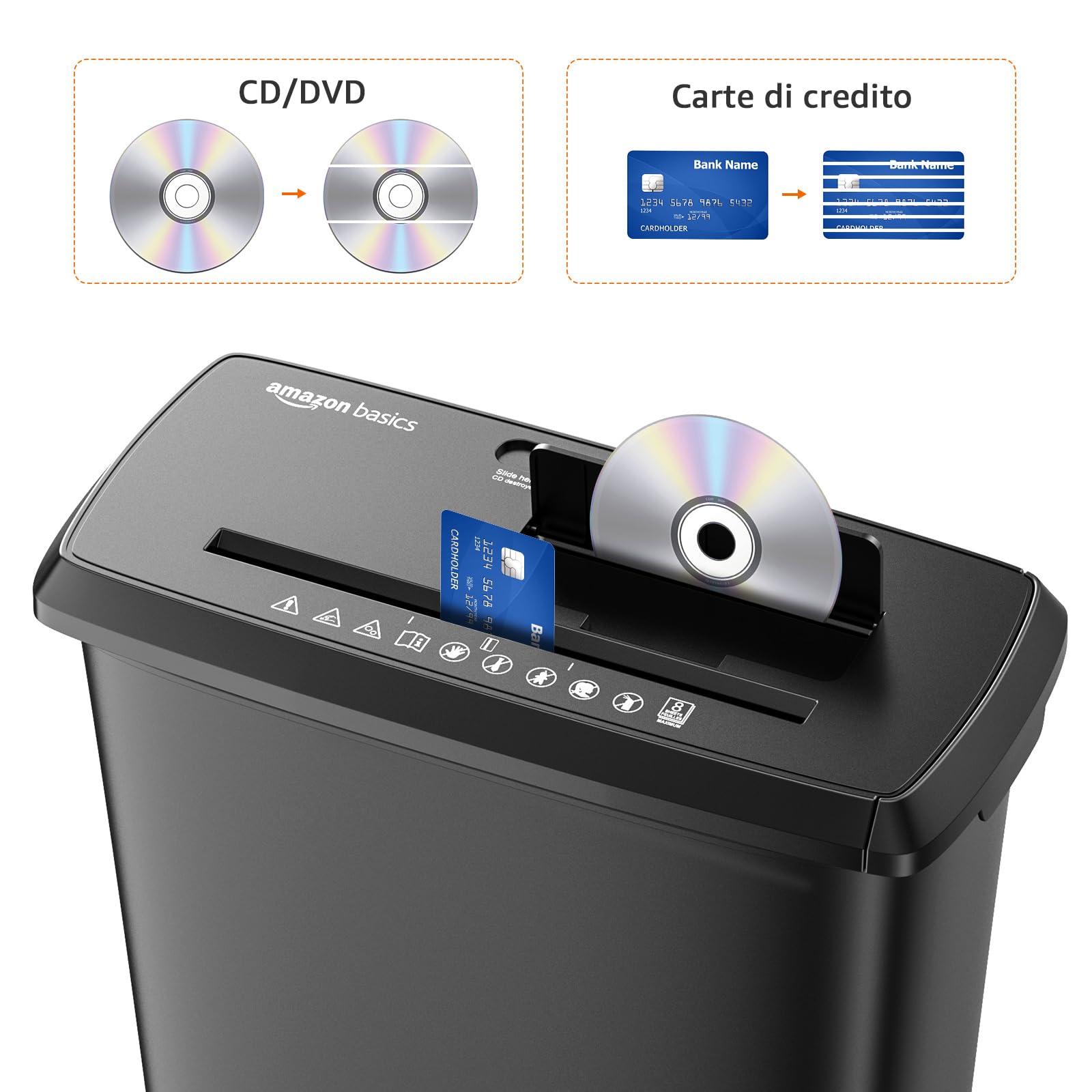 - Distrugge fino a 8 fogli di carta da 75 g/m² alla volta (non è necessario rimuovere punti metallici o piccole graffette); distrugge CD, DVD e carte di credito (uno alla volta, ma non adatto per carte di credito in metallo)