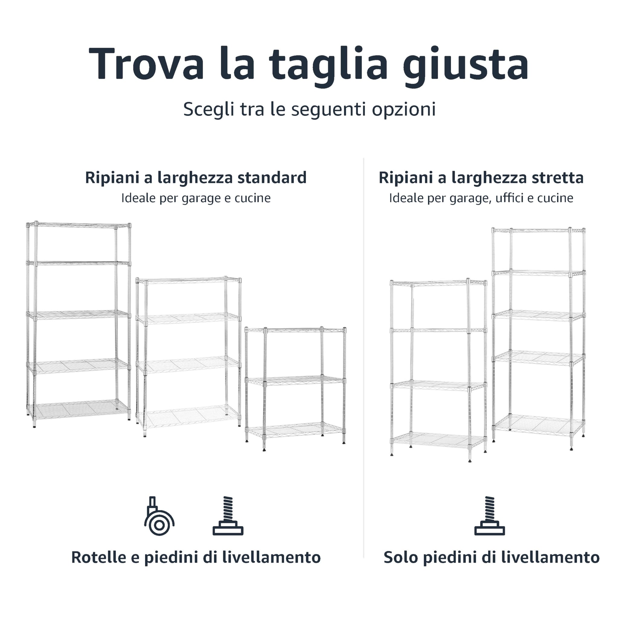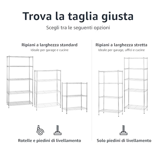 - Scaffalatura a 5 ripiani: realizzata in resistente acciaio con finitura cromata; con piedini di livellamento regolabili per una maggiore stabilità su superfici irregolari.