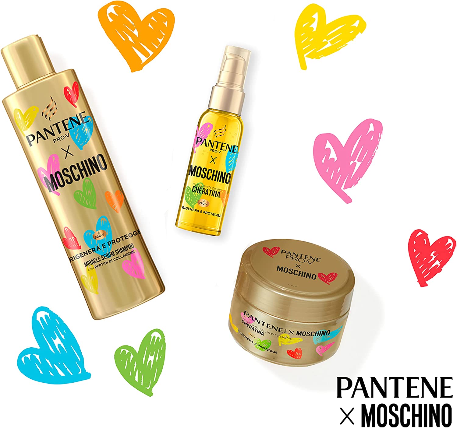 Edizione Limitata Pantete per Moschino per capelli 3X più forti. Lo shampoo Pantene Pro-V Rigenera & Protegge deterge delicatamente nutrendo i capelli grazie alle sostanze attive Pro-V. La maschera protezione cheratina ripara all’ istante i segni dei danni quali la rottura e la perdita di morbidezza e l'Olio capelli nutriente quotidiano, che aiuta a riparare i danni in 1 solo uso, rendendo i capelli 10 volte più resistenti alla rottura, e ne migliora la lucentezza. (danni da styling rispetto al solo shampoo senza agenti condizionanti).