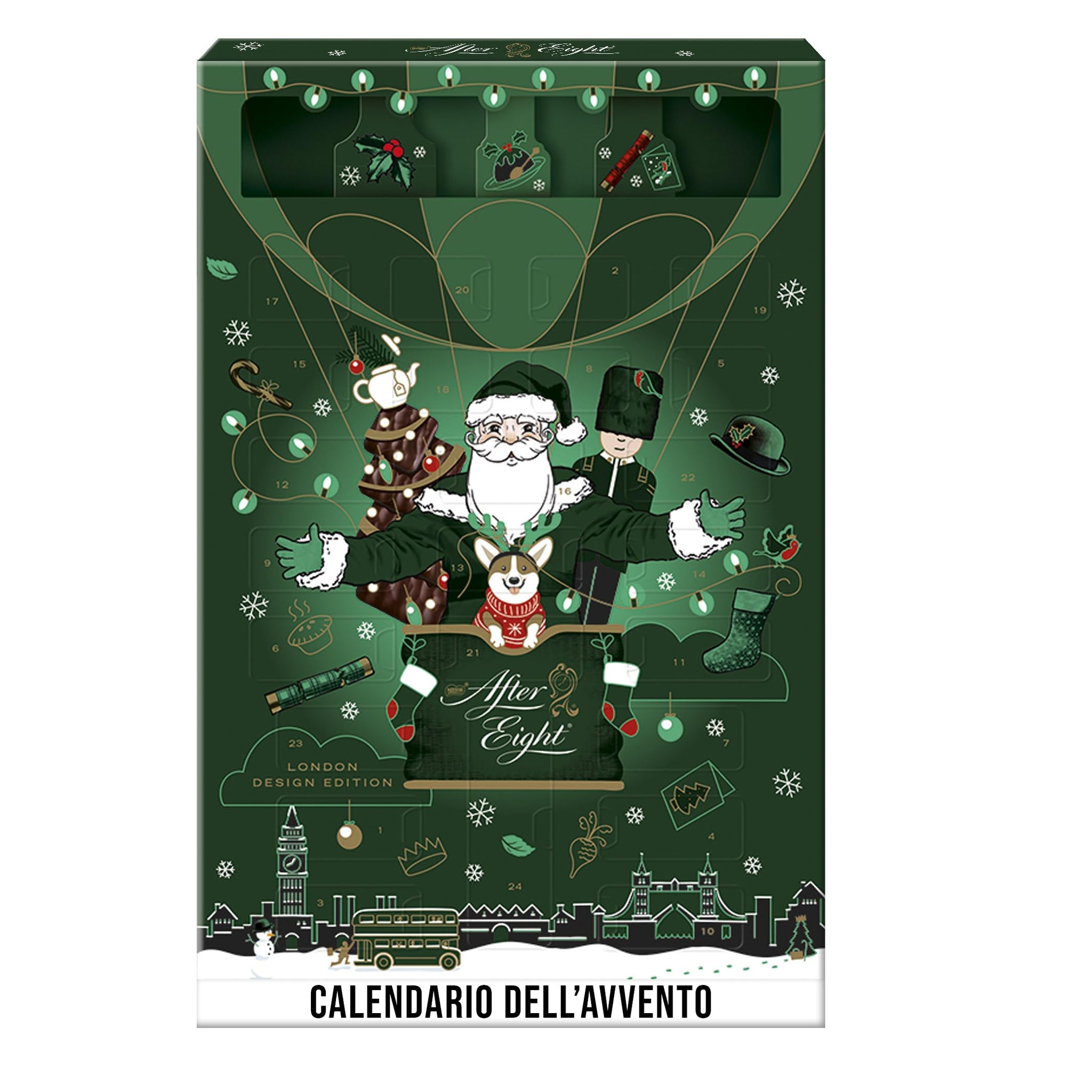 AFTER EIGHT Calendario dell’Avvento ti accompagna fino al giorno di Natale con divertenti e golosi Snack AFTER EIGHT. Contiene 15 London Icons, dalle forme ispirate ai simboli iconici della cultura inglese, 8 deliziose Baubles e 1 Babbo Natale per il 24 Dicembre. Le London Icons e le Baubles sono di cioccolato fondente, con un cremoso ripieno alla menta. Il Babbo Natale contenuto nell'ultima casella è di cioccolato fondente alla menta. L’attesa del Natale diventa ancora più entusiasmante e magica con il Calendario dell'Avvento AFTER EIGHT! Tutti i personaggi sono incartati singolarmente.
