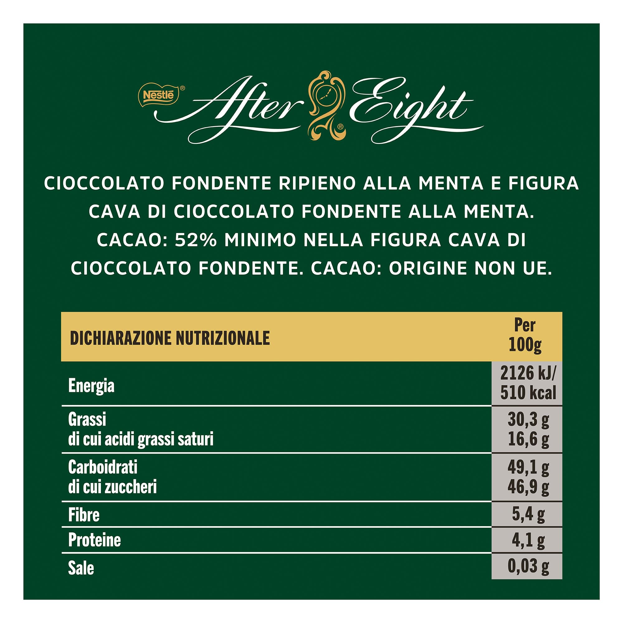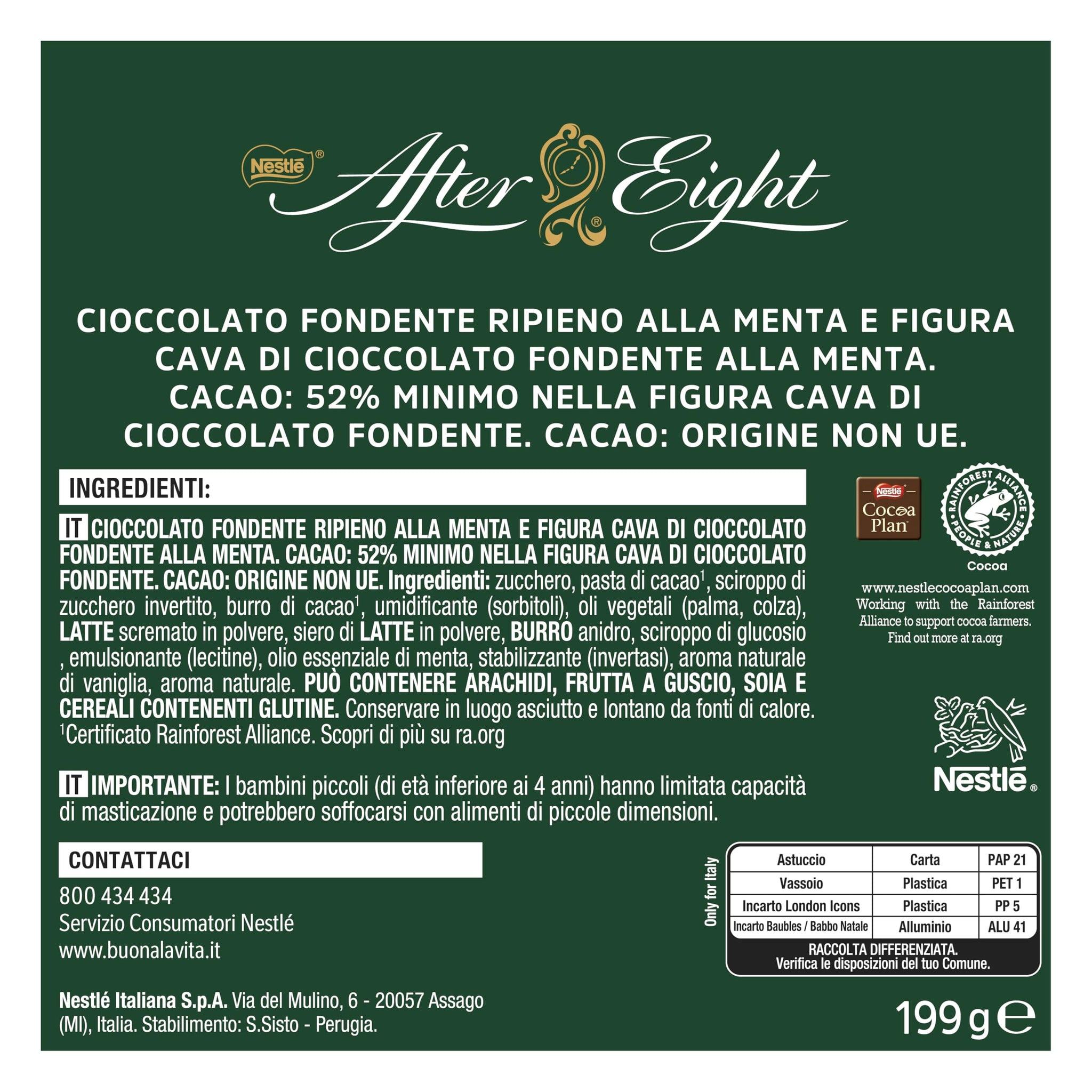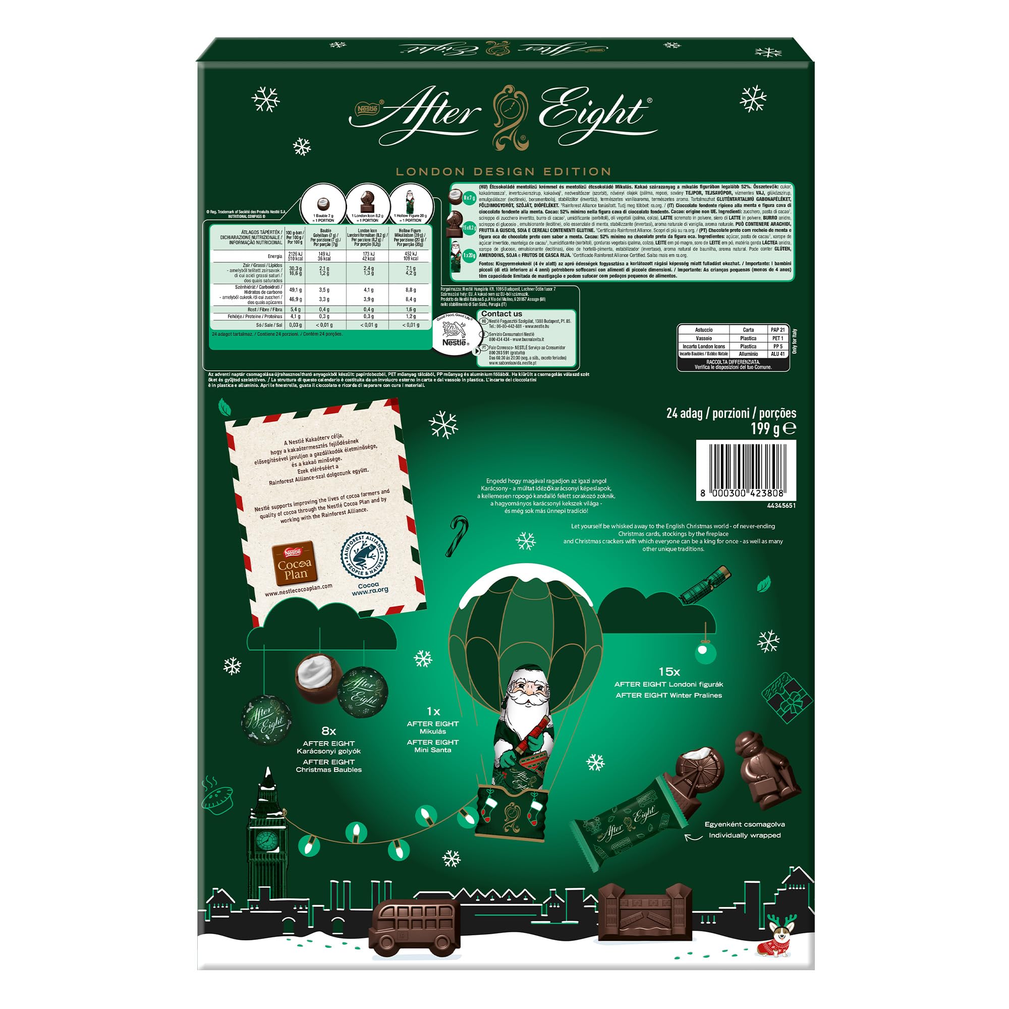 • Contiene 15 AFTER EIGHT London Icons, 8 AFTER EIGHT Baubles e 1 AFTER EIGHT Santa, tutti incartati singolarmente. Le London Icons e le Baubles sono di cioccolato fondente, con un cremoso ripieno alla menta. Il Babbo Natale contenuto nell'ultima casella è di cioccolato fondente alla menta