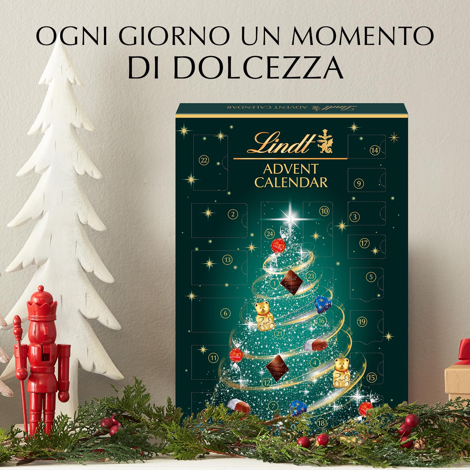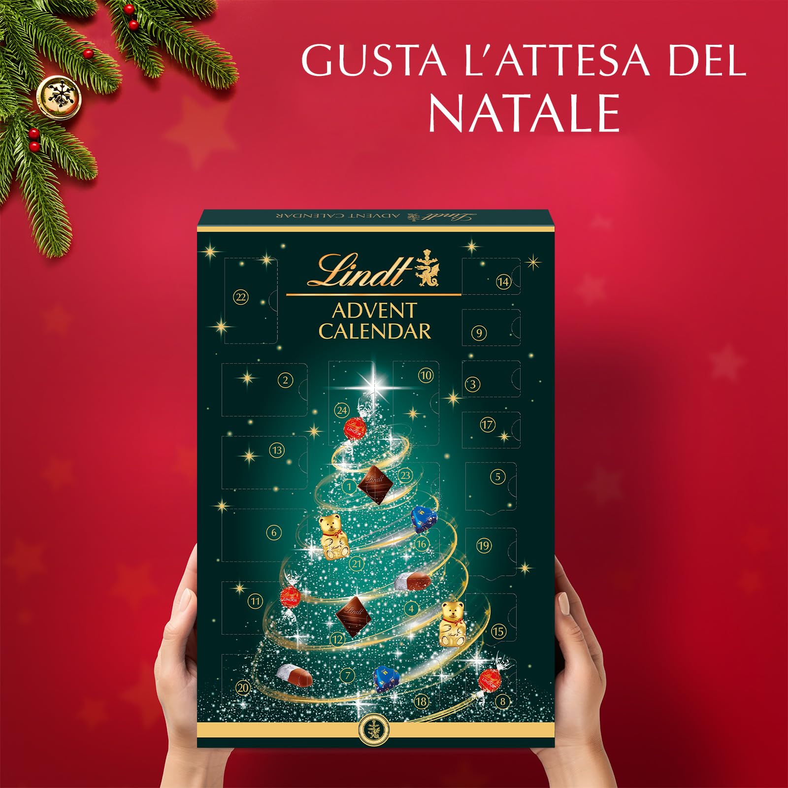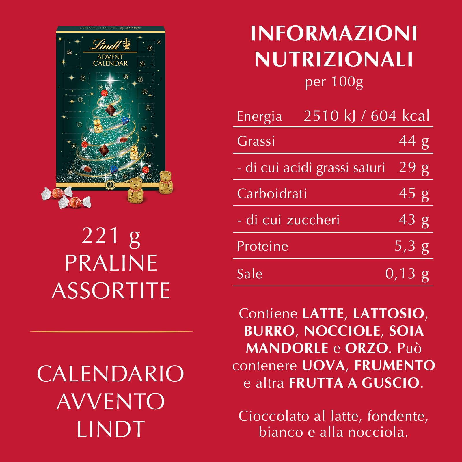 Calendario Avvento Albero di Lindt ti regala ogni giorno una squisita pralina per rendere unica la tua attesa del Natale. Contiene LINDOR ai gusti Latte, Cioccolato Bianco, Cioccolato Fondente 70% cacao e Nocciola, Petit Cour Latte e Fondente, Les Pyreneens Latte e Fondente, Mini Orsetto, Excellence Diamond Latte, Fondente 70% cacao, Fondente 85% Cacao, Fondente Fleur de Sel.