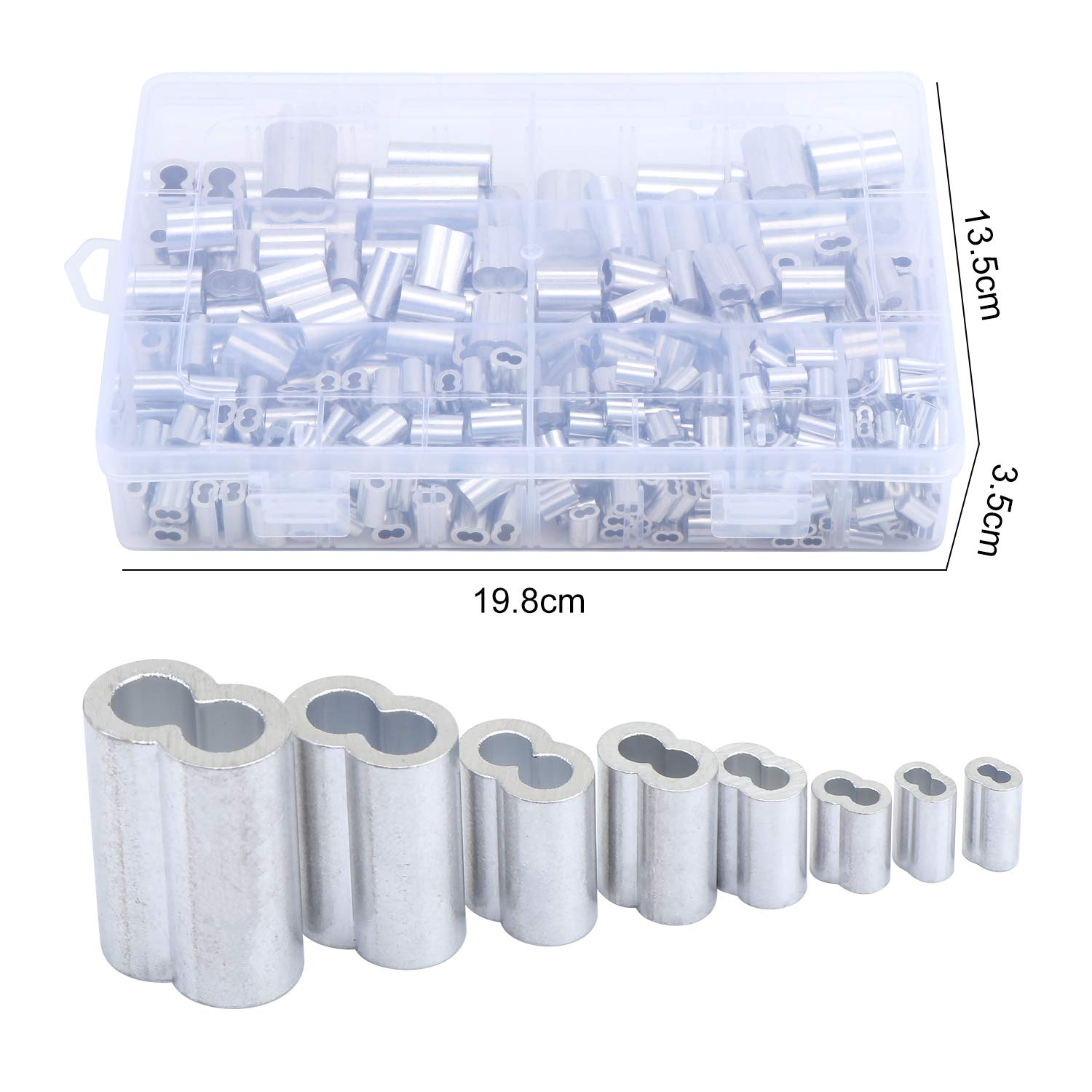 HSEAMALL - Set di 340 manicotti per corda metallica, in 8 misure, M1.2-M6, in alluminio, doppia ghiera per cavi e fili