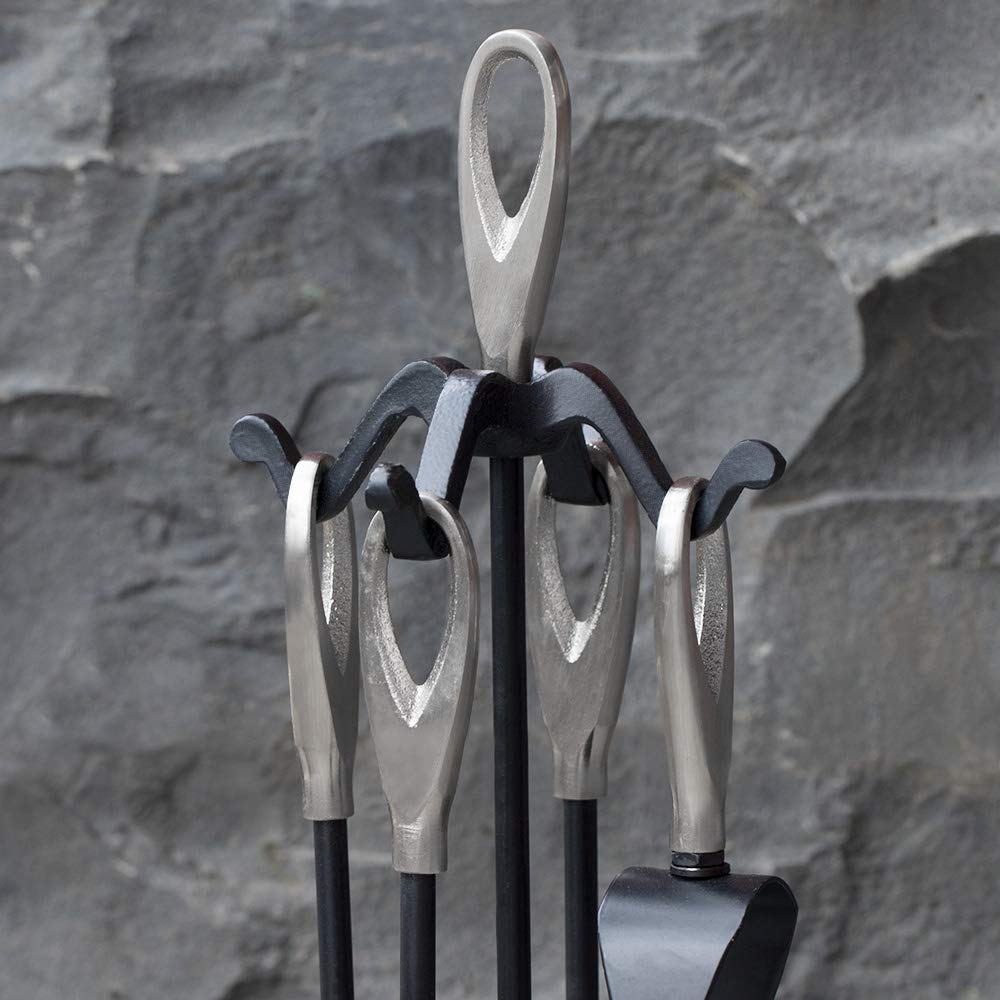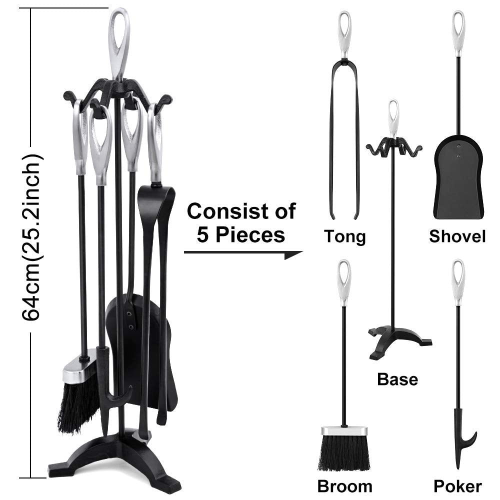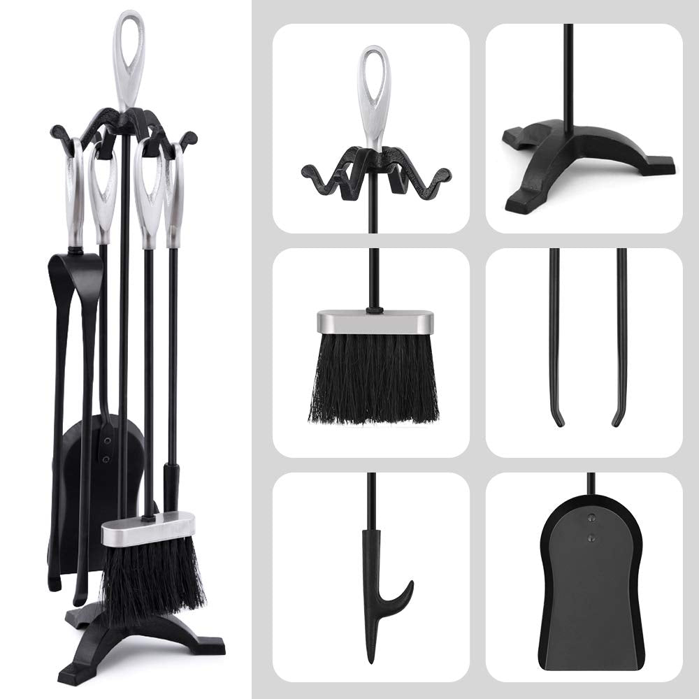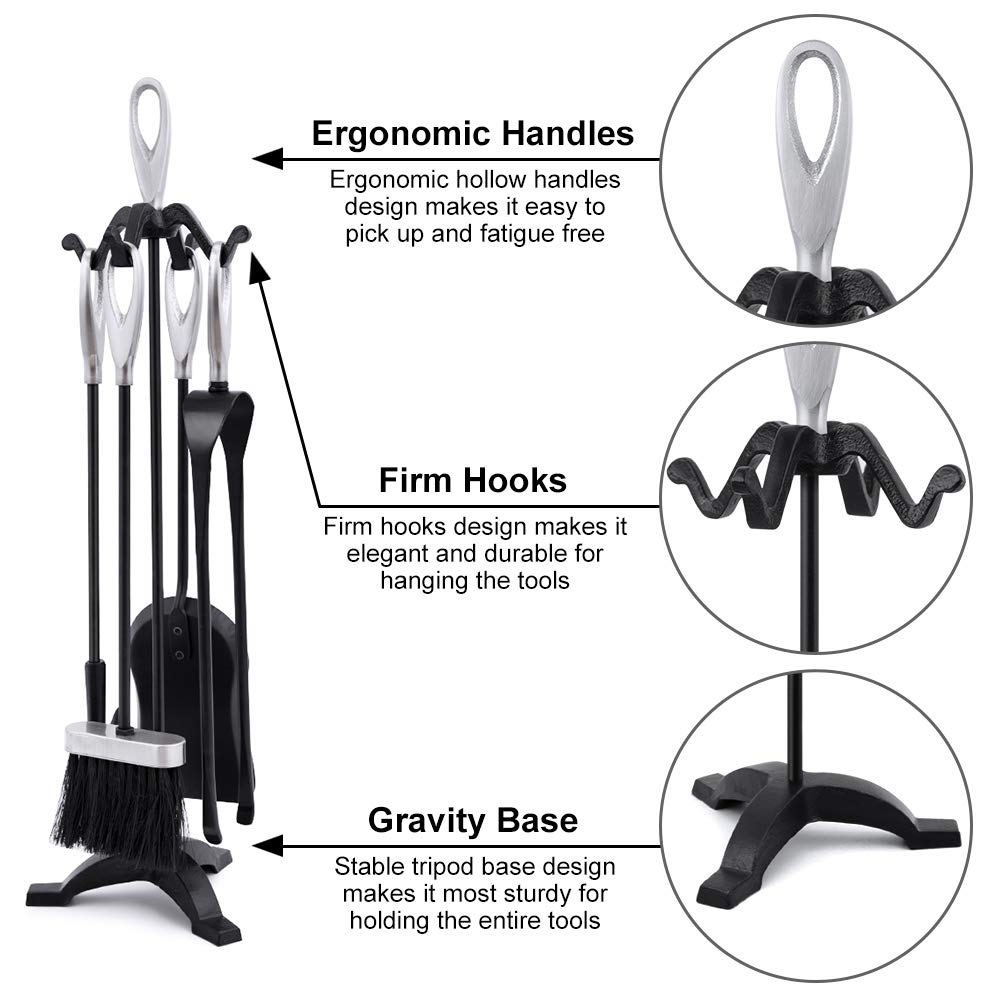 • DESIGN ERGONOMICO: set di 5 utensili per caminetti con impugnatura in argento incollato a colla per evitare cadute durante l'uso. Il design ergonomico delle maniglie cave facilita il prelievo e l'affaticamento. I ganci integrati del basamento del camino sul telaio rendono ordinato ogni attrezzo, sembra molto decoroso ed estetico