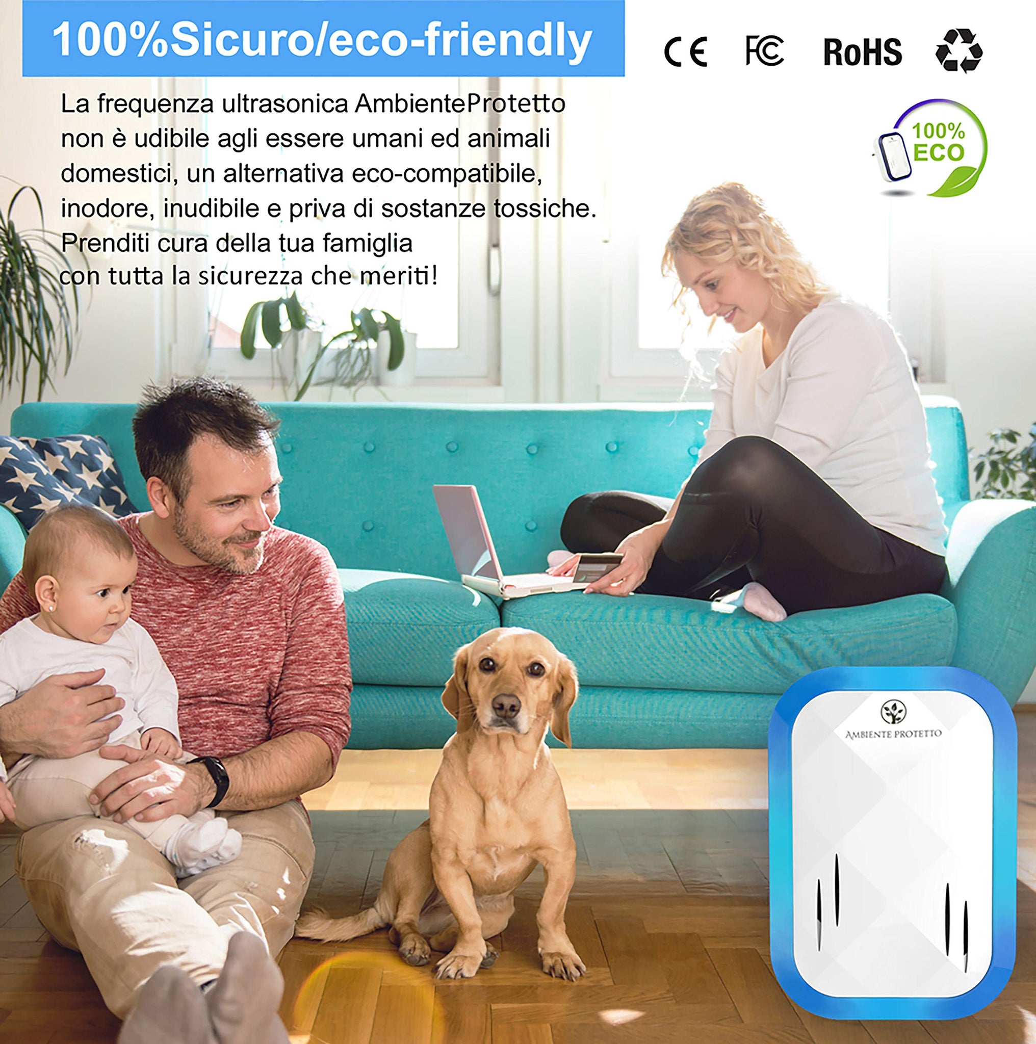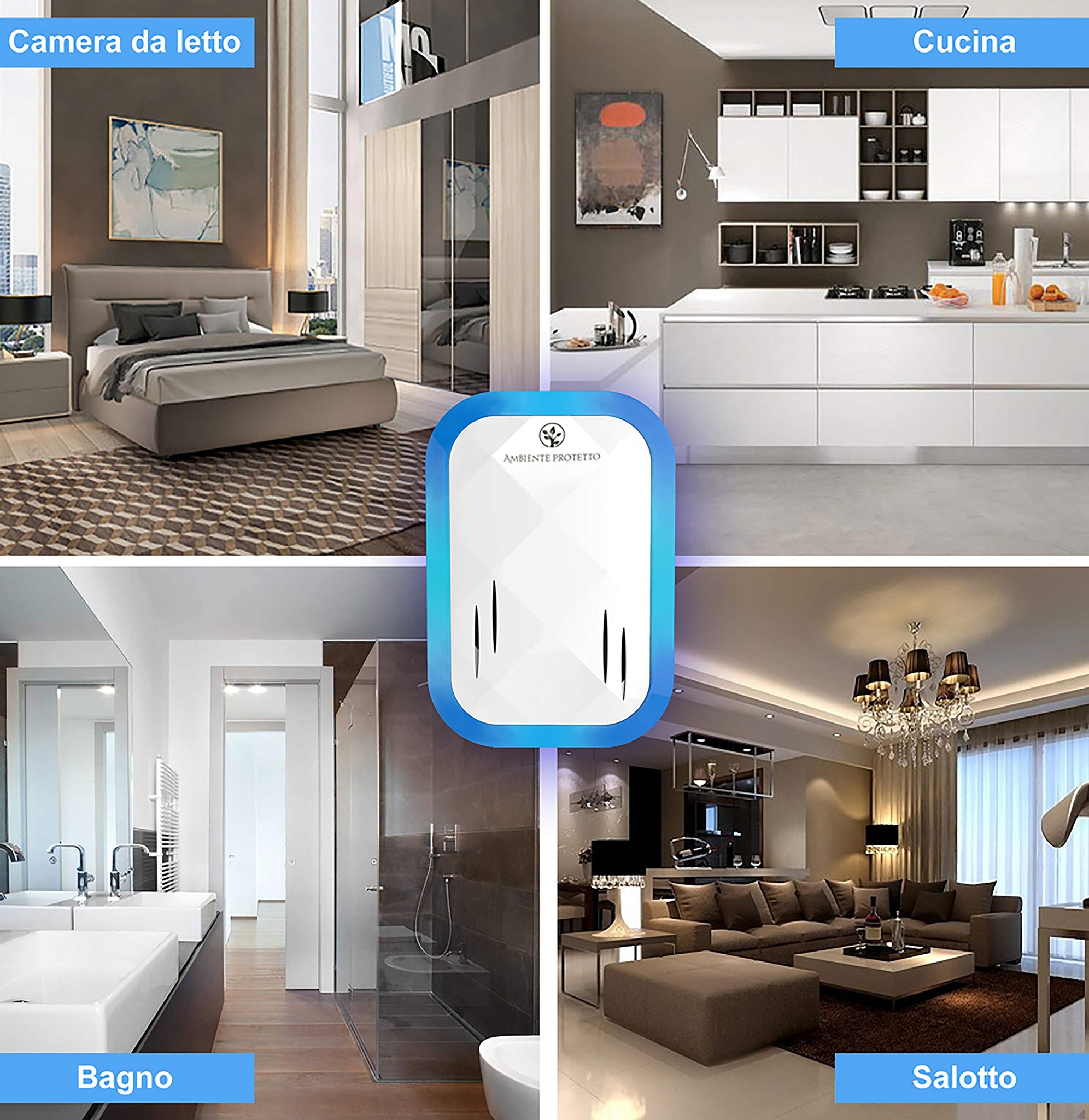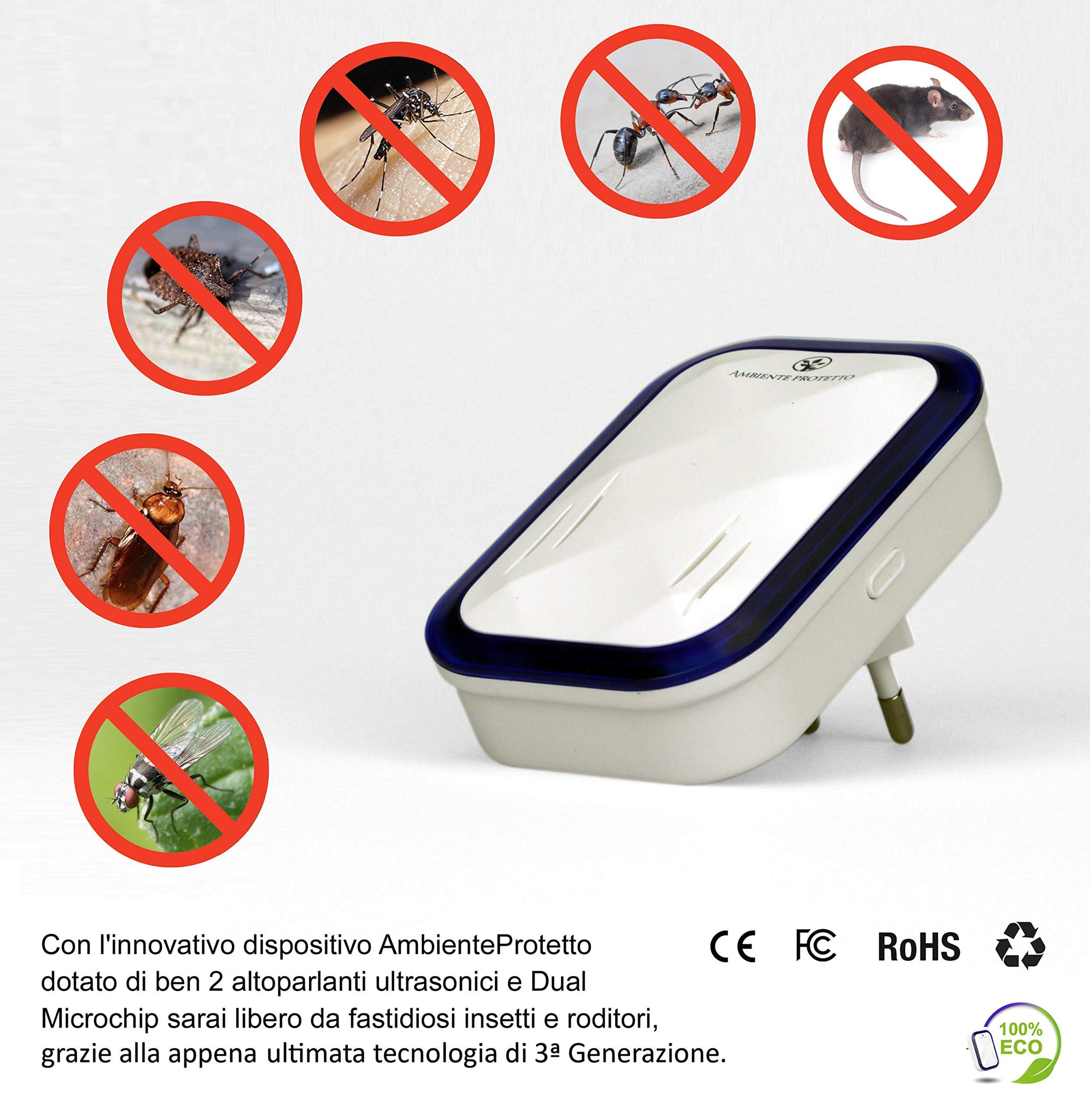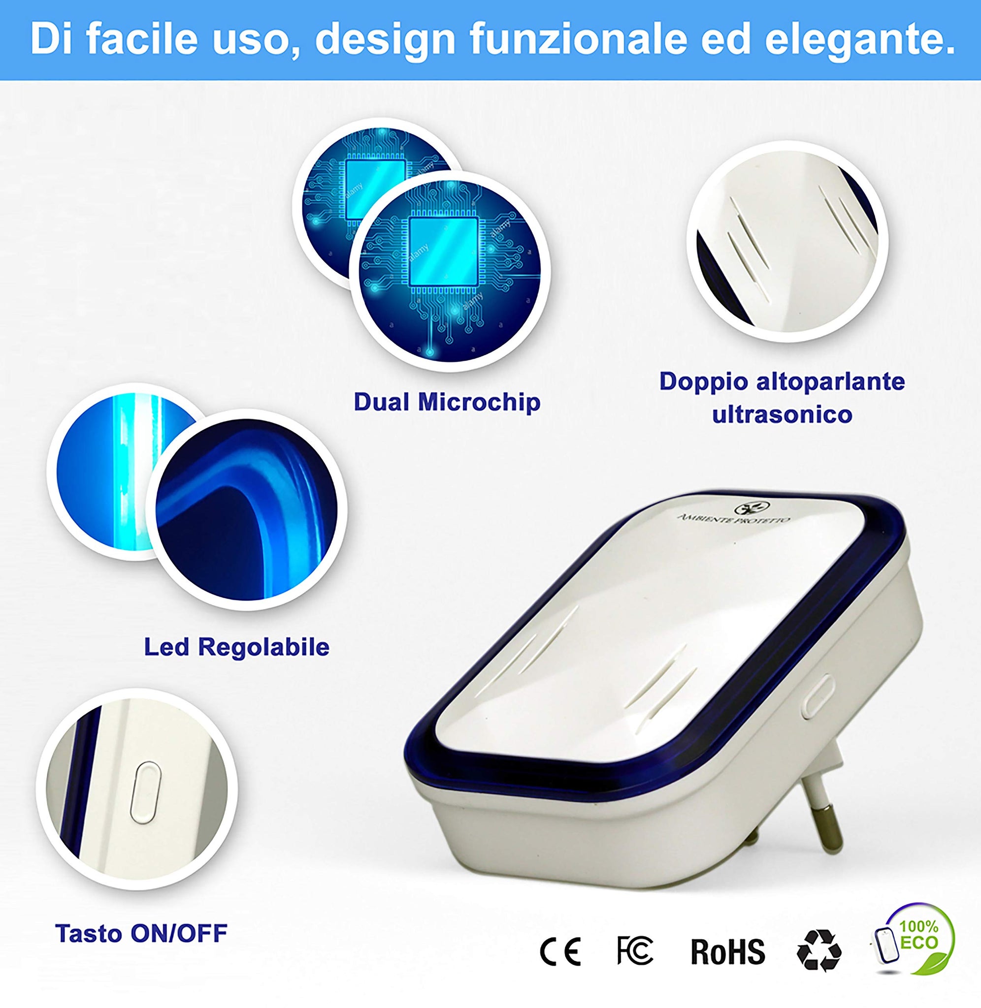- ✅【IL PIÙ EFFICACE】✅ AmbienteProtetto è il solo che integra contemporaneamente nello stesso dispositivo ben 2 microchip collegati ai 2 altoparlanti ultrasonici i quali, usando sistemi a multifrequenza variabile evitano l'immunità e assicurano una doppia efficacia rispetto a tutti gli altri dispostivi presenti sul mercato coprendo un range fino a 200 m2. Consigliamo l'uso di un dispositivo per stanza poichè gli ultrasuoni non possono attraversare le pareti.