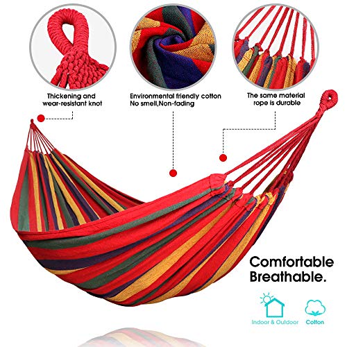 • COMODO TESSUTO IN COTONE: costruita con cotone affilatura serrata, in tessuto morbido, l’amaca offre una sensazione morbida, comoda per rilassarsi, progettata per temperature più freschi, restringe il flusso d’aria e preserva il calore corporeo. Lo spazio extra del letto e la minore altezza dal terreno la rendono popolare, quindi preparati a rilassarti e a goderti un pisolino pacifico.