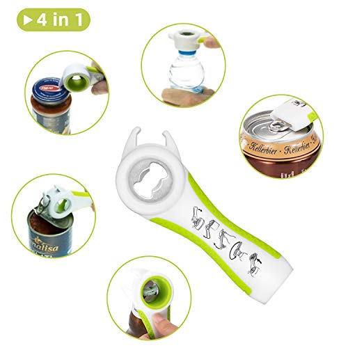 • Ampiamente apriscatole: l'apribottiglie 4 in 1 è progettato per accendere diversi tipi di tappi di bottiglia, coperchi di barattoli, barattoli di fagioli, coperchi delle bottiglie di sottaceti con forti sforzi. Gli apri hanno un design compatto e facile da riporre, il che è estremamente pratico in cucina.