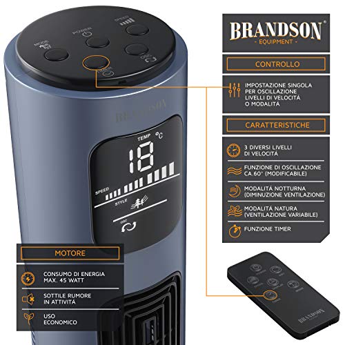 - ✓ARIA FRESCA : con il suo potente motore da 40W, questo ventilatore a torre di Brandson assicura una ventilazione ottimale, sia a casa che in ufficio. Il vantaggio del ventilatore a torre elegante e dalle dimensioni ridotte del marchio di qualità Brandson è quello che rispetto ai ventilatori convenzionali dispone di possibilità di impostazione aggiuntive, e, grazie alla sua conformazione, l'aria si distribuisce ad ampio raggio nell'ambiente. Tutte le modalità possono essere azionate comodamente