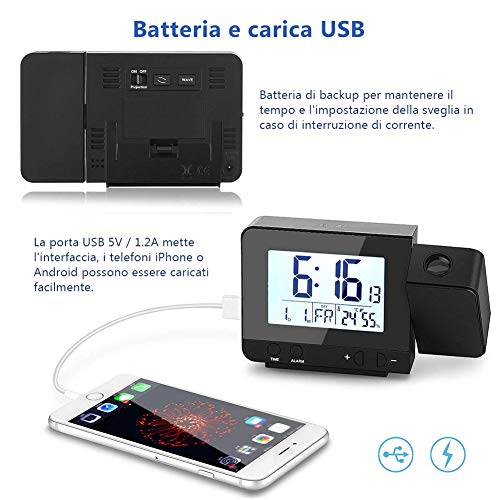Sveglia con proiettore è un design compatto e leggero, confezionato in una lussuosa scatola, che lo rende la scelta regalo perfetta o il compagno di viaggio perfetto. Doppio allarme con snooze consente di definire due allarmi separati per scopi diversi. Con Snooze, questo allarme ti dà cinque minuti in più di sonno. 2 minuti di squillo forte, il miglior allarme per chi ha il sonno pesante. Premere un tasto diverso da quello superiore per interrompere l'allarme. L'allarme verrà attivato automaticamente il giorno successivo. Indica tempo e temperatura dotati di sensori di qualità professionale, termometri e monitor di umidità interna forniscono le misurazioni più accurate, indicando la temperatura e l'umidità ambientale, per determinare se sono necessarie delle regolazioni. Il risveglio della stanza perfetta offre a te e alla tua famiglia le migliori condizioni di vita. Usa la funzione loop o arcobaleno per impostare il colore desiderato per la modifica illuminazione. Se si desidera che la retroilluminazione LCD e la proiezione del tempo si accendano per alcuni secondi, inserire 2 batterie AAA nell'orologio e premere il pulsante superiore. Previsioni meteo L'orologio può prevedere l'evoluzione di tempo, pressione e temperatura per le successive 12 ore. Porta di ricarica USB per smartphone Progettato con un'uscita USB da 5V 1A, questo orologio ricarica il tuo smartphone durante la notte. Specifiche del prodotto: Hardware LCD: Pannello VA Distanza di trasmissione: 200 piedi Distanza di proiezione: 1 e 3 metri Angolo di proiezione: -90 ~ 90 ° Batteria: 2 x AAA (non inclusa) Contenuto: 1 x Sveglia con Proiettore 1 x cavo USB 1 x manuale di istruzioni