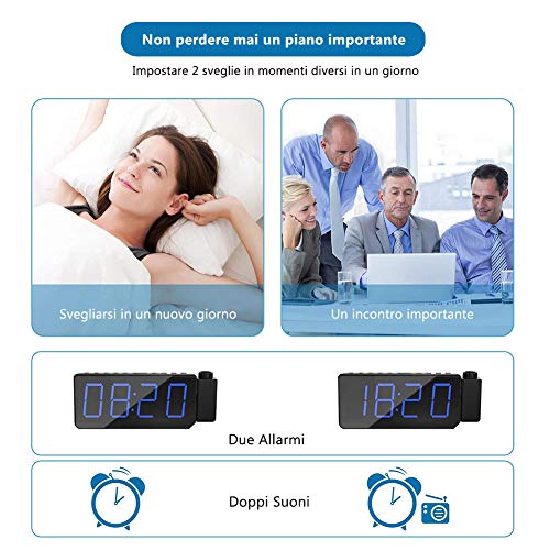 - 【Doppio allarme con funzione di ripetizione】: consente di impostare due allarmi separati per scopi diversi. Con Snooze, questo allarme ti dà cinque minuti in più di sonno. 2 minuti di squillo forte, il miglior allarme per chi ha il sonno pesante. Premere un tasto diverso da quello superiore per interrompere l'allarme. L'allarme verrà attivato automaticamente il giorno successivo. L'orologio di proiezione è ciò che lo rende la scelta regalo perfetta o il compagno di viaggio perfetto.