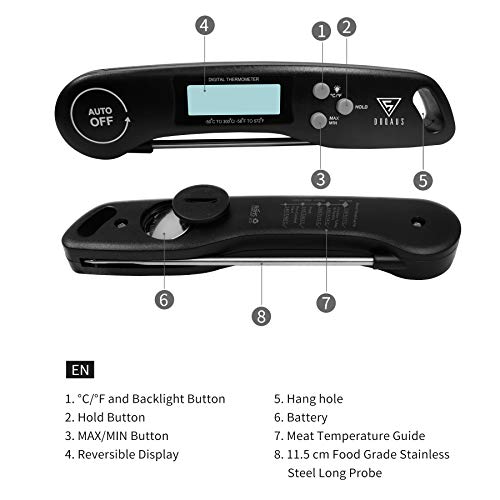 - [Rimborso del 100% e 18 mesi di garanzia]: acquista in sicurezza. Se non sei soddisfatto del termometro per carne DOQAUS, puoi contattarci e porre domande per una sostituzione o un rimborso. Buon servizio clienti, tutte le tue domande riceveranno risposta entro 24 ore. Quando ordini un termometro per carne, non corri alcun rischio!