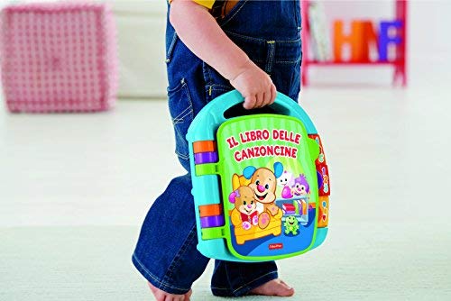Il Libro delle canzoncine Fisher-Price è un giocattolo per imparare interattivo per bambini dai 6 mesi in su. Con 6 filastrocche cantate come "Fai La Torta" o "Rema Rema La Barchetta Va" e illustrazioni colorate con i personaggi Ridi e Impara preferiti dai bambini, il libro elettronico musicale incoraggia il vostro bambino a girare le pagine e a cantare con la musica. Questo giocattolo educativo per bambini è dotato anche di 3 grossi pulsanti luminosi con lettere, numeri e forme per aiutare il vostro piccolo a imparare i colori, le prime parole, a leggere e a contare. Girando le pagine e premendo i pulsanti, i bambini possono scoprire la causalità e imparare il concetto di azione e reazione. Grazie alla pratica maniglia sul lato superiore, il Libro delle canzoncine Fisher-Price può essere trasportato facilmente ovunque voglia il vostro bambino.