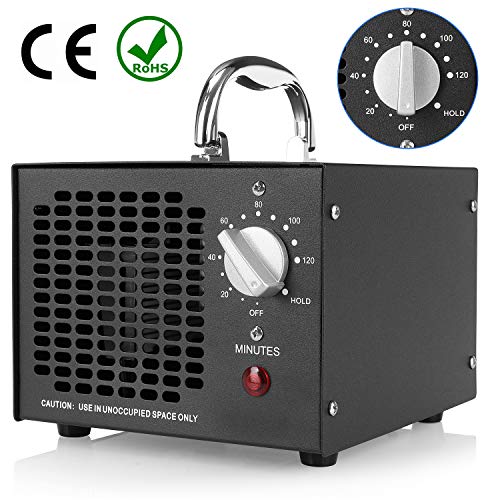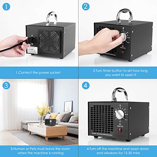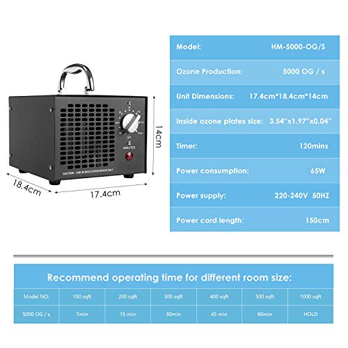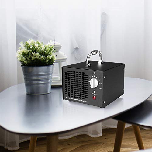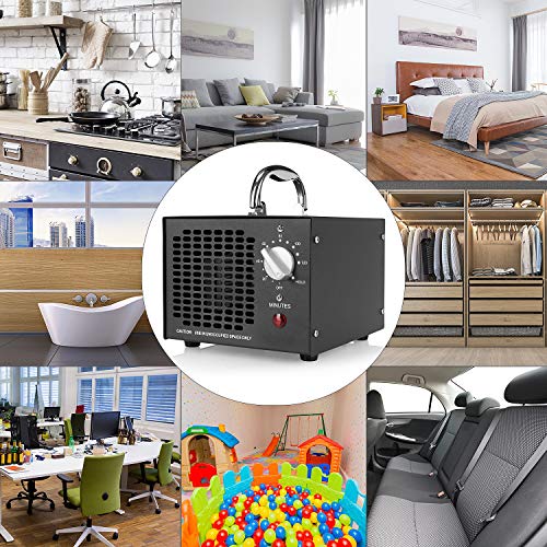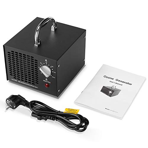 - [AMPIA GAMMA DI APPLICAZION]I: Area massima di utilizzo: 1000 sqft, Il generatore di ozono è molto adatto per case, uffici, stanze per animali domestici, stanze per fumatori, cantine ammuffite, automobili, hotel, navi, ospedali, scuole, aree danneggiate dal fuoco e altre stanze più grandi. È un deodorante ideale E disinfettante.