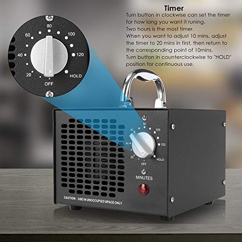 - [FACILE DA USARE]: Guscio in acciaio inossidabile, resistente alla corrosione, facile da pulire. Semplice pannello di controllo, utilizzando la manopola sul pannello di controllo, è possibile impostare la modalità di temporizzazione e la modalità di funzionamento continuo e avviare il generatore di ozono in pochi secondi. Il tempo di elaborazione può essere impostato in base alle dimensioni della stanza e all'intensità dell'odore da eliminare.