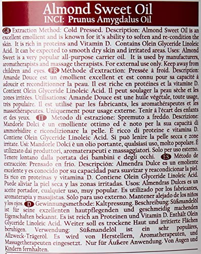Olio vegetale di mandorla dolce. Nome botanico: Prunus amygdalus. Ottenuto a partire da/parte della pianta: semi. Metodo di estrazione: spremitura a freddo. Altri nomi: N.A. Origine: Spagna, Italia o Stati Uniti. Descrizione: la mandorla dolce è un emolliente eccellente, noto per la sua capacità di ammorbidire e nutrire la pelle. Ricco di proteine e vitamina D, è considerato estremamente nutriente, in particolare quando viene utilizzato regolarmente. Contiene acido linoleico. È indicato per alleviare secchezza cutanea e irritazioni. I massaggiatori devono essere consapevoli che l'olio può macchiare. Colore: giallo dorato. Descrizione dell'aroma: mandorla dolce leggermente profumata, caratteristica della maggior parte degli oli vegetali. Usi comuni: la mandorla dolce è un olio vegetale molto popolare e versatile. Utilizzato da produttori, aromaterapeuti e massaggiatori. Coerenza: tipica e caratteristica dell'olio vegetale. Assorbimento: si assorbe nella pelle a velocità media, lasciando una leggera sensazione oleosa sulla pelle. Durata della conservazione: la mandorla dolce impiega molto tempo a diventare stantia; pertanto può essere usata 6 mesi - 1 anno se riposta adeguatamente (in un luogo fresco, lontano dall'irraggiamento diretto del sole). Raccomandiamo di tenere al fresco il prodotto dopo l'apertura. Avvertenze: N.A. Note importanti: le informazioni sono solo a fini educativi.