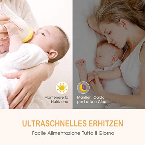 - MODALITÀ DI RISCALDAMENTO SUPER-VELOCE: Con una potenza di 500W, scaldabiberon è in grado di scaldare latte delicatamente e ugualmente in un modo di massima velocità. Ci vuole solo 3 minuti, una bottiglia di latte di 240ml viene scaldata da 4°C a 37°C con controllo della temperatura accurata. Risparmia molto tempo.