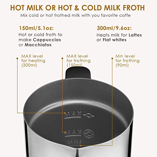 - 【 3 diverse funzioni 】 schiuma fredda, schiuma calda e riscaldamento. Capacità massima: 115 ml per la produzione di schiuma calda di latte, 240 ml (per la produzione di latte caldo o acqua). Perfetto per cappuccino, cappuccino, cappuccino, latte, cioccolato caldo e altro, proprio come il vostro barista preferito.