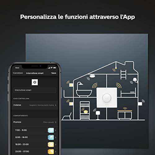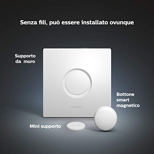 Descrizione Prodotto Luce connessa per la tua smart home Philips Hue è il sistema di illuminazione connessa wireless che ti consente di controllare con facilità le luci e di creare l'atmosfera giusta per ogni momento. Leggi di più Philips Hue Pulsante Smart Questo piccolo pulsante svolge un grande ruolo. Con un singolo clic puoi controllare le luci, tenendolo premuto aumenti o diminuisci la luminosità. Meglio ancora: le luci si accendono con i nostri livelli di colore consigliati e con luminosità in base all'orario della giornata. Controlla le luci con un clicImposta la luce in base all'oraFunzionalità personalizzataCon montaggio flessibile e wireless Leggi di più Controlla le luci con un clic Con un singolo clic puoi controllare le tue luci intelligenti: non serve nessuno smartphone. Premi una volta per accendere o spegnere le luci oppure tieni premuto il pulsante per aumentare o diminuire la luminosità. Già configurato per fare esattamente ciò di cui hai bisogno, lo Smart Button di Philips Hue è pronto all'uso ovunque ti serva. Funzionalità personalizzata Creare un comando personalizzato sullo Smart Button di Philips Hue nell'app Hue è facile. Modifica le impostazioni predefinite del pulsante secondo le tue necessità: imposta una scena di luce personalizzata o programmata, controlla tutte le luci di una stanza. La luce giusta al momento giusto Lo Smart Button di Philips Hue è così intelligente da sapere esattamente quale luce impostare quando lo premi. A seconda del momento della giornata, il pulsante Smart regolerà al meglio il colore e la luminosità delle luci, basandosi sulla luce naturale all'esterno. Hai bisogno di un pieno di energia di mattina o di un'atmosfera rilassante dopo una lunga giornata? Il tuo Smart Button sa esattamente quale luce impostare. Con montaggio flessibile e senza fili Grazie alla tecnologia wireless puoi installare lo Smart Button di Philips Hue in pochi secondi in qualsiasi punto della casa. Sostituisci un interruttore esistente con la piastra di montaggio inclusa o utilizza il mini-supporto per posizionarlo su qualsiasi superficie. Se preferisci mantenerlo portatile, nessun problema: il pulsante è magnetico, per cui puoi posizionarlo su qualsiasi superficie magnetica, come ad esempio il frigorifero. Leggi di più