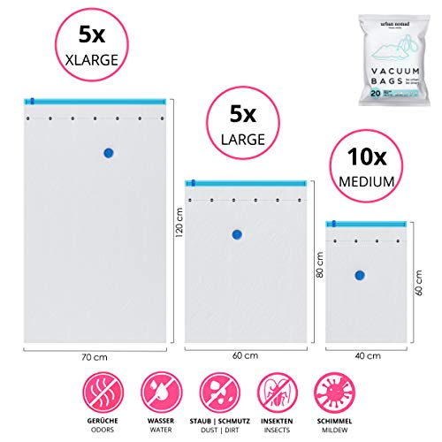 - ✅ #1 CONFEZIONE VUOTA CON 20 SACCHETTI IN 3 DIMENSIONI - PER OGNI SITUAZIONE: Con i nostri 10 sacchetti piccoli (40cm x 60cm), 5 medi (60cm x 80cm) e 5 grandi (70cm x 120cm) in plastica di qualità extra spessa, potete comprimere, proteggere e riporre tutti i vostri vestiti, lenzuola e altri oggetti, risparmiando spazio in modo eccellente e super economico - a casa, in viaggio o in vacanza.