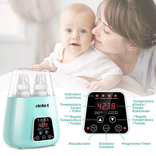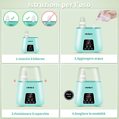 - Multifunzionale 6 in 1 - I programmi di impostazione includono riscaldamento latte, scongelamento, riscaldamento pappe ed omogeneizzati, riscaldamento latte in polvere e/o altre bevande istantanee, sterilizzazione (rimuove fino al 99% dei batteri) e programmazine di accensione, lo scaldabiberon ELEHOT è il perfetto alleato per preparare tutti gli alimenti necessari alla crescita del tuo bimbo