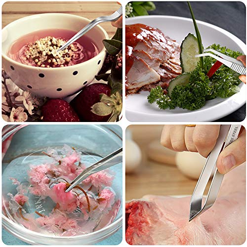 - GRAFFETTA ANTISCIVOLO DI PRECISIONE - Il design a pinzetta a punta fine afferra facilmente oggetti delicati, il design offset rende il cibo più facile da maneggiare. Il design piatto e inclinato delle pinzette è più facile da avvicinare alla superficie dell'oggetto, nitido, pratico e conveniente e no danno alla carne circostante