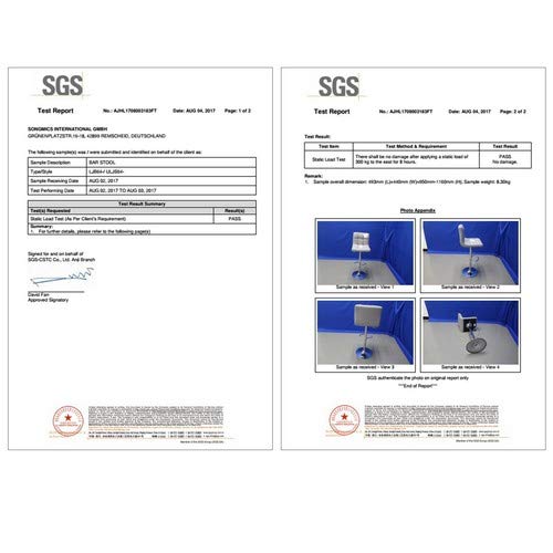 - Il pistone a gas ha passato il test SGS secondo la norma BIFMA X5.1 (Num; di test: AJHL1712004551FT, titolare del test: fornitore); la struttura in acciaio cromato e la base ben salda di Ø 41 cmdonano allo sgabello da bar una portata di 200 kg, non oscillerà ogni volta che ti giri a guardare la TV