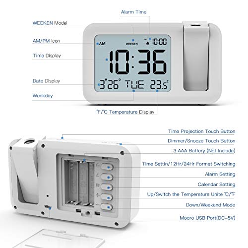 - 【9 MINUTI FUNZIONE SNOOZE E MODALITÀ WEEKEN】 Il pulsante Snooze consente di spegnere facilmente il cicalino senza aprire gli occhi. Il tempo Snooze predefinito è 9 minuti. L'orologio digitale emetterà un allarme ogni 9 minuti fino a quando non si disattiva la modalità snooze premendo un altro tasto. Imposta la modalità weekend e lascia che la sveglia non suoni mai nel fine settimana. Questa sveglia a proiezione intelligente ti sveglia comodamente.