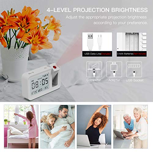 - 【4 LUMINOSITÀ DI PROIEZIONE E 2 SUONI DI ALLARME REGOLABILI】Con 4 luminosità di proiezione regolabile (0%, 10%, 60%, 100%). Porta USB (cavo USB incluso) o batterie AAA da 3 pezzi (non inclusa). È possibile caricarlo facilmente in molti dispositivi come l'adattatore CA, la banca di alimentazione o il computer, evitando che la batteria si scarichi mentre si dorme, si svegli e si risparmi energia.
