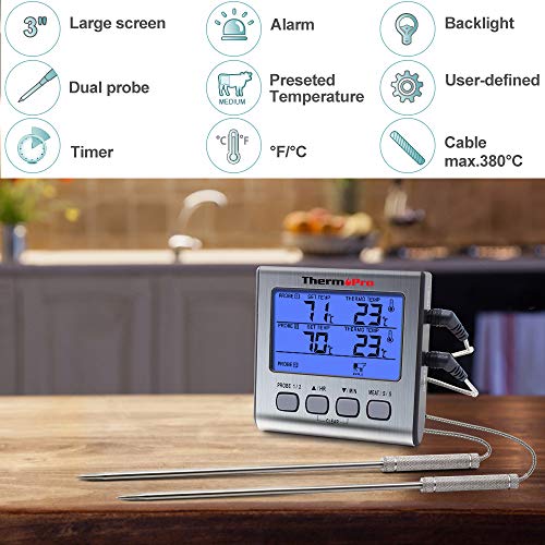 ThermoPro TP17 Termometro Cucina Digitale a Doppia Sonda con Modalità Timer e Display LCD per Cottura BBQ Alimenti Carne Forno Arrosto Griglia