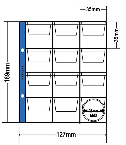 • Iclude 5 fogli per monete a 12 caselle sulla pagina con bordo rinforzato; caselle con linguetta che si sovrappone: 35mm x 35mm; per monete medie fino a 28 mm di diametro: 2, 1 euro, 1-2 sterline inglesi, 50 penny olimpici, ecc