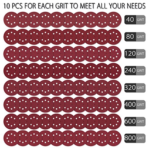 80 pezzi dischi abrasivi Ø 125 mm assortimento: grana da 10 X 40/80/120/240/320/400/600/800 per smerigliatrice orbitale di 8 dischi carta vetrata