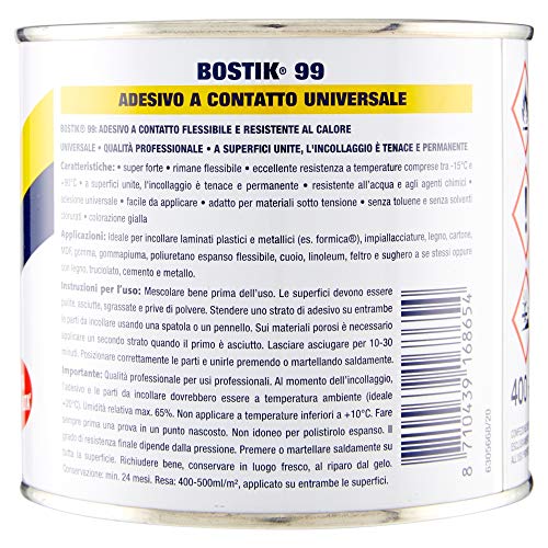 Taglia:400 ml Adesivo a contatto universale ad alta resistenza al calore. Incolla laminati plastici, linoleum, sughero, gomma, spugna, finta pelle telata su legno, truciolare, compensato, metallo, muratura, vetroresina.