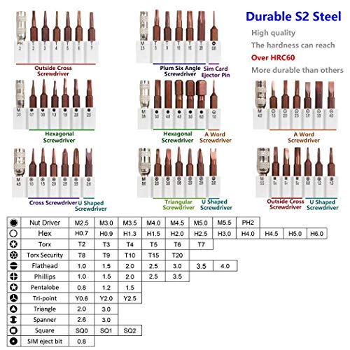 • AlTA QUALITA: Il ket 63 in 1, 56 cacciaviti di precisione è stato progettato in acciaio in lega di vanadio cromato, La durezza raggiunge fino a 56HRC, Il rivestimento superficiale può garantire la capacità antiruggine. Elevata durezza e alta precisione possono prolungare la durata. Kit di attrezzi di riparazione affidabile