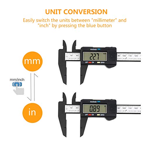 Display LCD: 1/2 "x1 1/2" (13 mm x 38 mm) Il calibro offre precisione e può essere resettato quando vuoi. I numeri visualizzati sullo schermo LCD sono chiari, grandi e di lettura facile. Può essere usato per misurare la lunghezza, la profondità, il volume esterna ed interna. Conversione elettronica digitale pinza in pollici / metrica / frazioni Gamma di misura: 0-6 pollici / 150 mm Precisione: ± 0,001 "/ 0,02 mm Risoluzione: 0.0005 "/0.01mm, 1/128" * si accende automaticamente quando si sposta il cursore. * Mantiene zero molto bene. Il calibro è uno straordinario strumento di misurazione per progettisti, ingegneri e falegnami. È dotato di una lettura digitale LCD extra-largo per misurazioni interne ed esterne precise. Il display dello stesso può essere azzerato in qualsiasi punto della diapositiva. Garanzia di rimborso al 100%: se non sei soddisfatto dell'articolo, non esitare a contattarci per una sostituzione o un rimborso. Nessuna domanda, nessuna seccatura, nessun tempo perso!