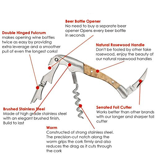 - IL MIGLIOR RIMOZIONE DEI SOLDI DEL SUGHERO MANUALE COMPRERÀ MAI - La bellissima impugnatura in legno è progettata con un Fulcrum a doppia cerniera e formata per darti una sensazione unica dell'apribottiglie del vino e offre un ottimo controllo quando si rimuove il tappo, dalla bottiglia di vino. Il tagliavetro dentellato Smaier rende questa chiave da vino un'ottima opzione, offre tutti gli strumenti necessari per aprire la tua bottiglia di vino con stile - ecco perché la nostra chiave da vino vi