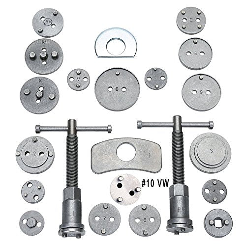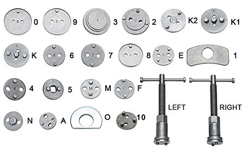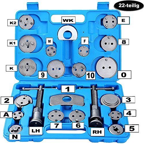 - Il robusto Set di ripristino pistone viene usato per ripristinare il pistone del freno ai freni con disco, ganasce freno o cambio delle pastiglie. Il Set con 22 pezzi può essere utilizzato universalmente per quasi tutti i costruttori di veicoli. Questo Set e necessario sopratutto per ogni veicoli con un freno a mano nella pinza, vale a dire il cavo del freno a mano agisce direttamente sul pistone del freno a disco.