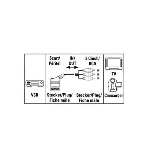 Nome stile:Scart - 3x RCA Connettore 1: SCART (21-pin) Connettore 2: RCA 3x Lunghezza del cavo: 1,5 m Sesso tipo: maschio / maschio Colore del prodotto: Nero Per collegare videocamera stereo con uscite RCA a sistemi televisivi o video, registratori con ingresso Scart Per la registrazione si alternano entrambi i modi con IN / OUT cavo dritto 75 ohm Video fili Dettagli tecnici Tipo di prodotto: Collegamento 2: RCA-Plug 3xLunghezza: 1,5 mQualità: 1 stellaColore: NeroConnessione 1: Scart