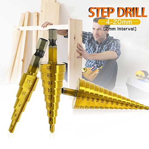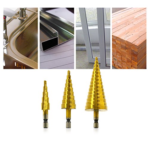 Hiveseen Kit 3 Punte Coniche, Fresa Conica Trapano a Gradini, HSS Titanium, Misure 4-12/4-20/4-32, Buco Cutter a Scalini per Eseguire Foro In Metallo Acciaio Ottone Legno Plastica Ferro