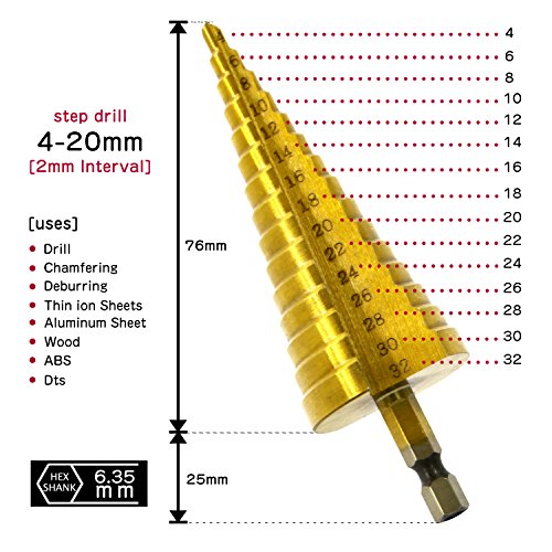 - Utilissimo set composto da tre frese coniche in acciaio con misure 3, 4-12mm, 4-20mm 4-32mmgrazie alle quali potrete forare o allargare i fori in base alle vostre esigenze casalinghe o professionali.